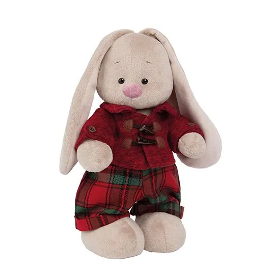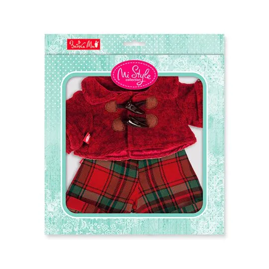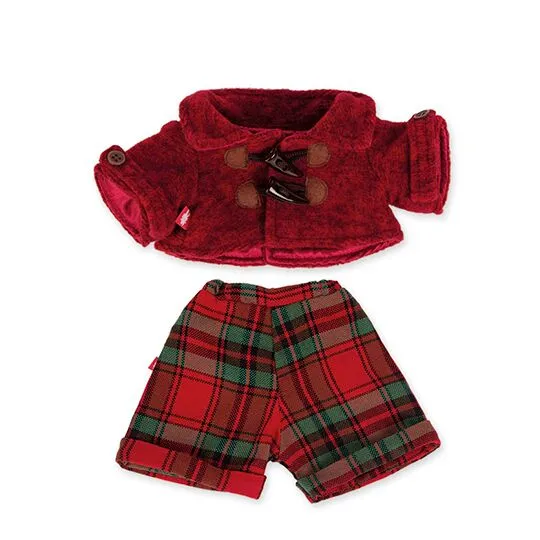 В комплект одежды для Зайки Ми "Идеальное сочетание" входят: красный жакет на пуговках и штанишки в зеленую клеточку.