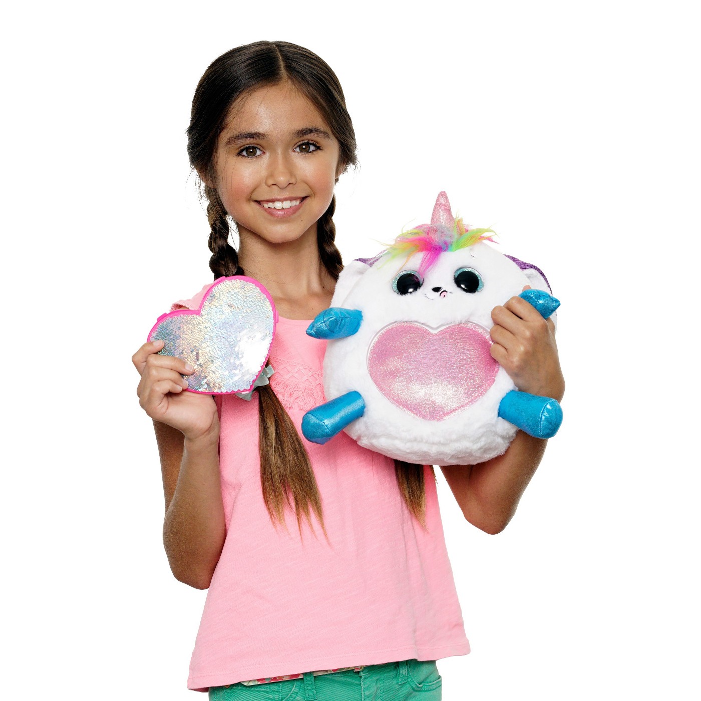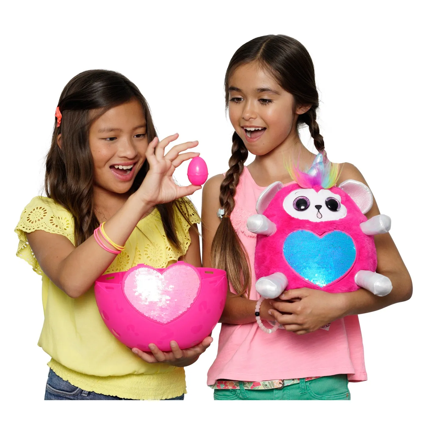 Яркое таинственное яйцо с рогом содержит в себе милую плюшевую игрушку, мини-яйцо с маленьким питомцем и блестящее сердце с посланиями.