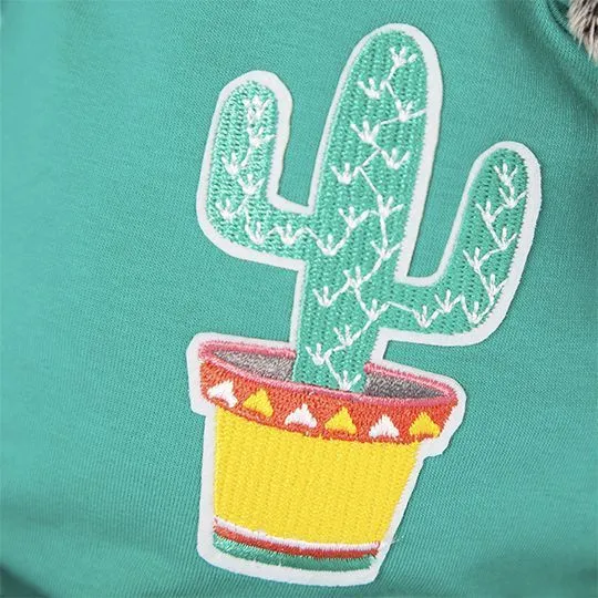 - комбинезон украшен тканой термоаппликацией в виде кактуса в цветочном горшочке