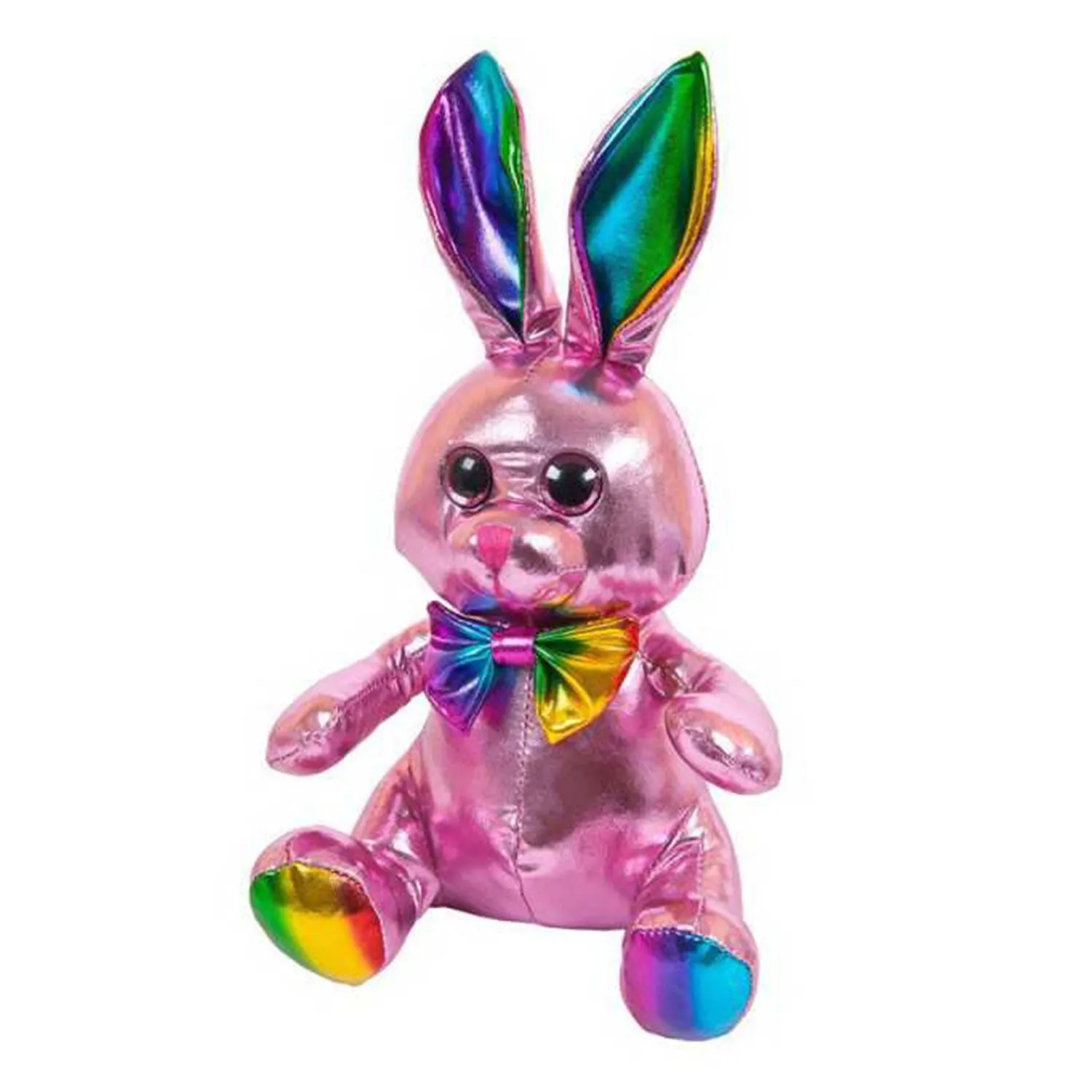 - розовый кролик из блестящего гладкого материала с разноцветными вставками