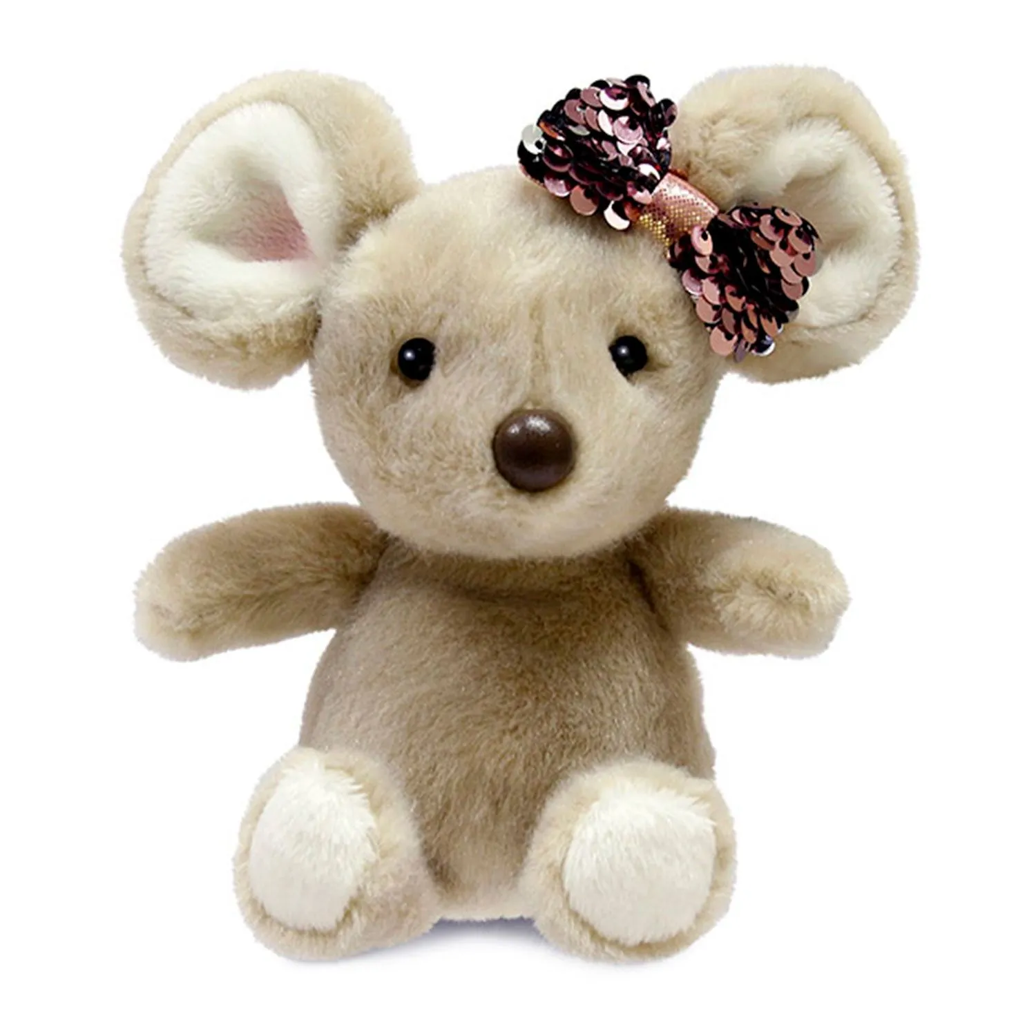 Потрясающая серая мышка с черными круглыми глазами и коричневым носиком, круглыми бело-розовыми ушками и пушистой шерсткой.