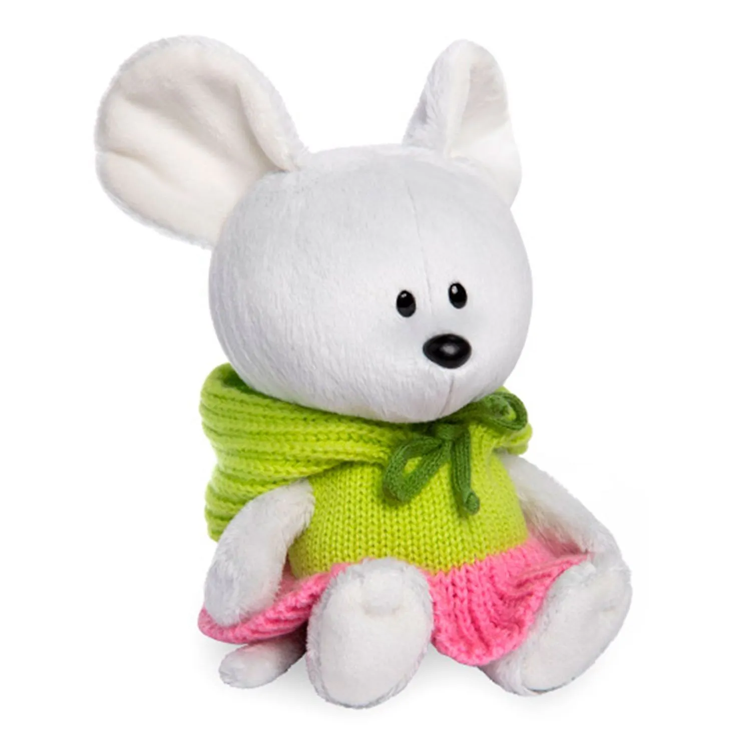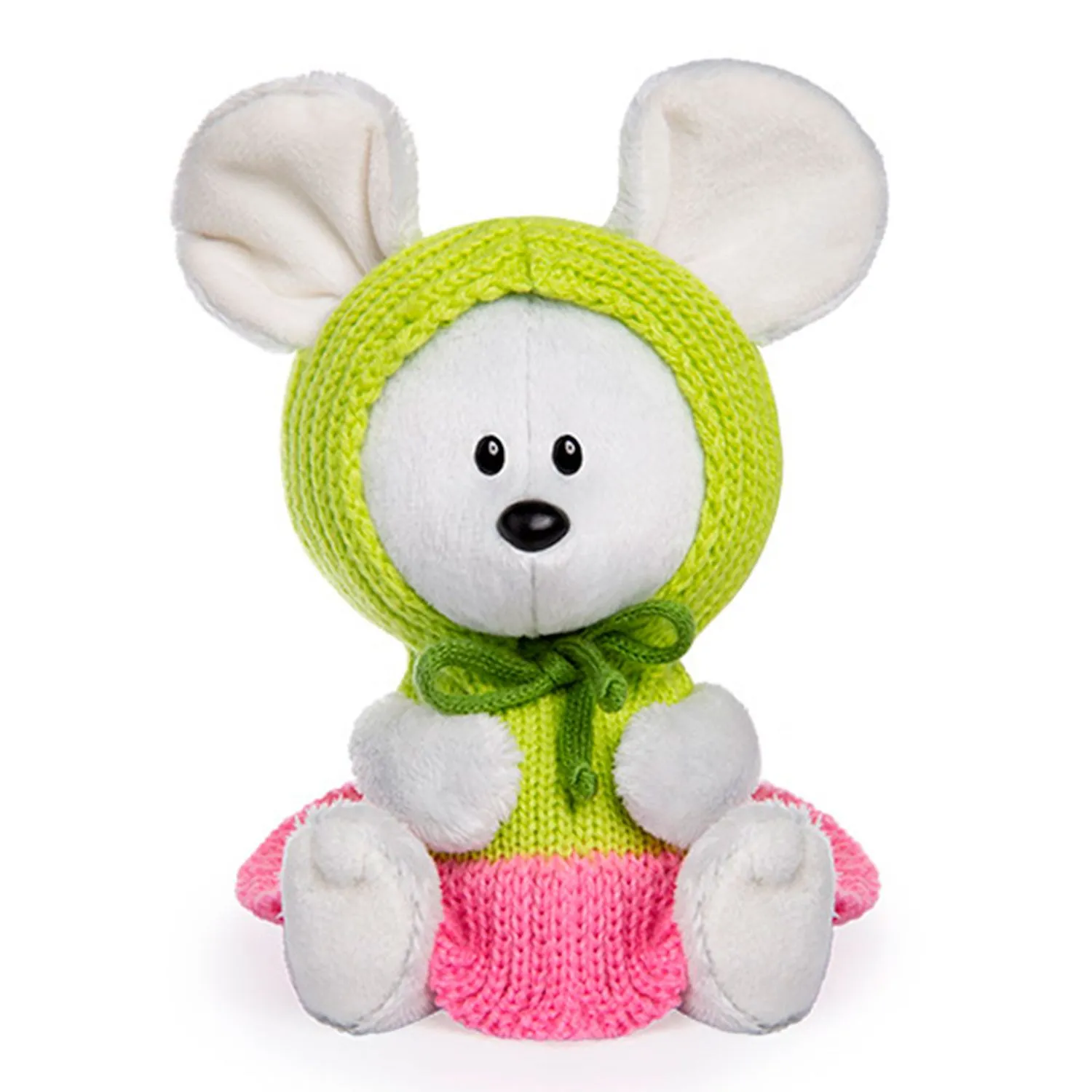 Мышка в ярком вязаном платье с капюшоном, оборкой и шнурком, завязанным на бантик.