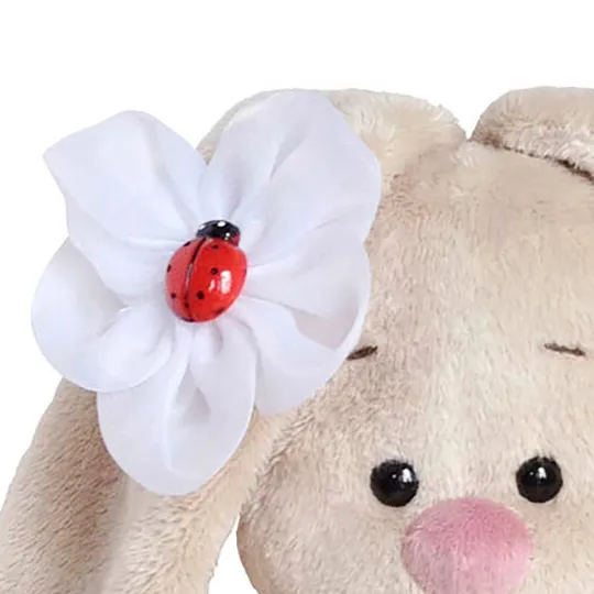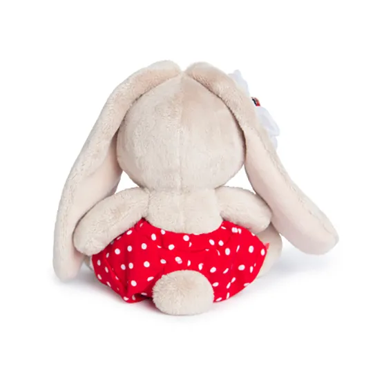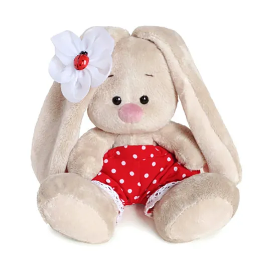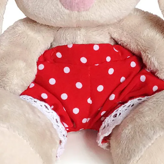 На Зайке забавные красные панталончики в белый горошек, украшенные белоснежным хлопковым кружевом. На ушке у Зайки - нежный белый цветок из органзы, в центре которого маленькая божья коровка.
