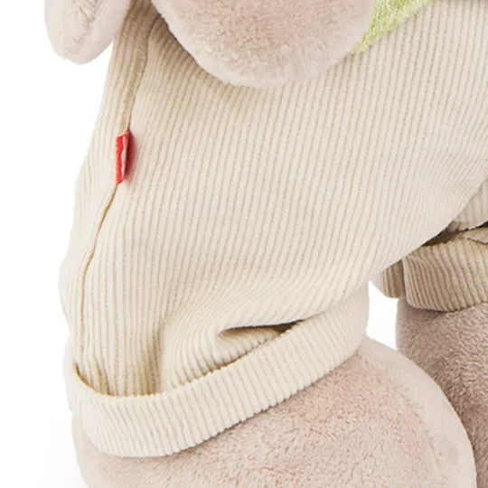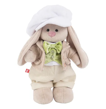 Романтичный комплект для Зайки мальчика, состоящий из вельветовых брючек молочного цвета, белоснежной рубашки, бархатного жилета цвета полыни и бежевого жакета из твида в рубчик. Комплект дополняет галстук бабочка из бархата и объёмная кепка из белоснежного софта.