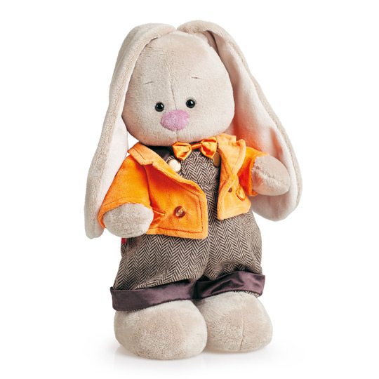 Элегантный костюмчик, состоящий из шерстяного комбинезончика с карманчиком и бархатного пиджачка цвета облепихи. Комплект украшает галстук-бабочка из оранжевого атласа.