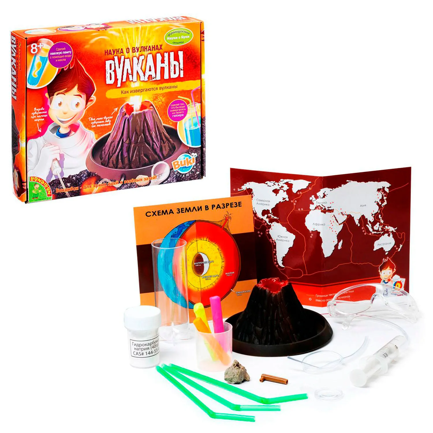 - кроме того, в наборе «Наука о вулканах» содержится миниатюрная модель вулкана, у которой можно устроить извержение с помощью смеси уксуса и специального порошка