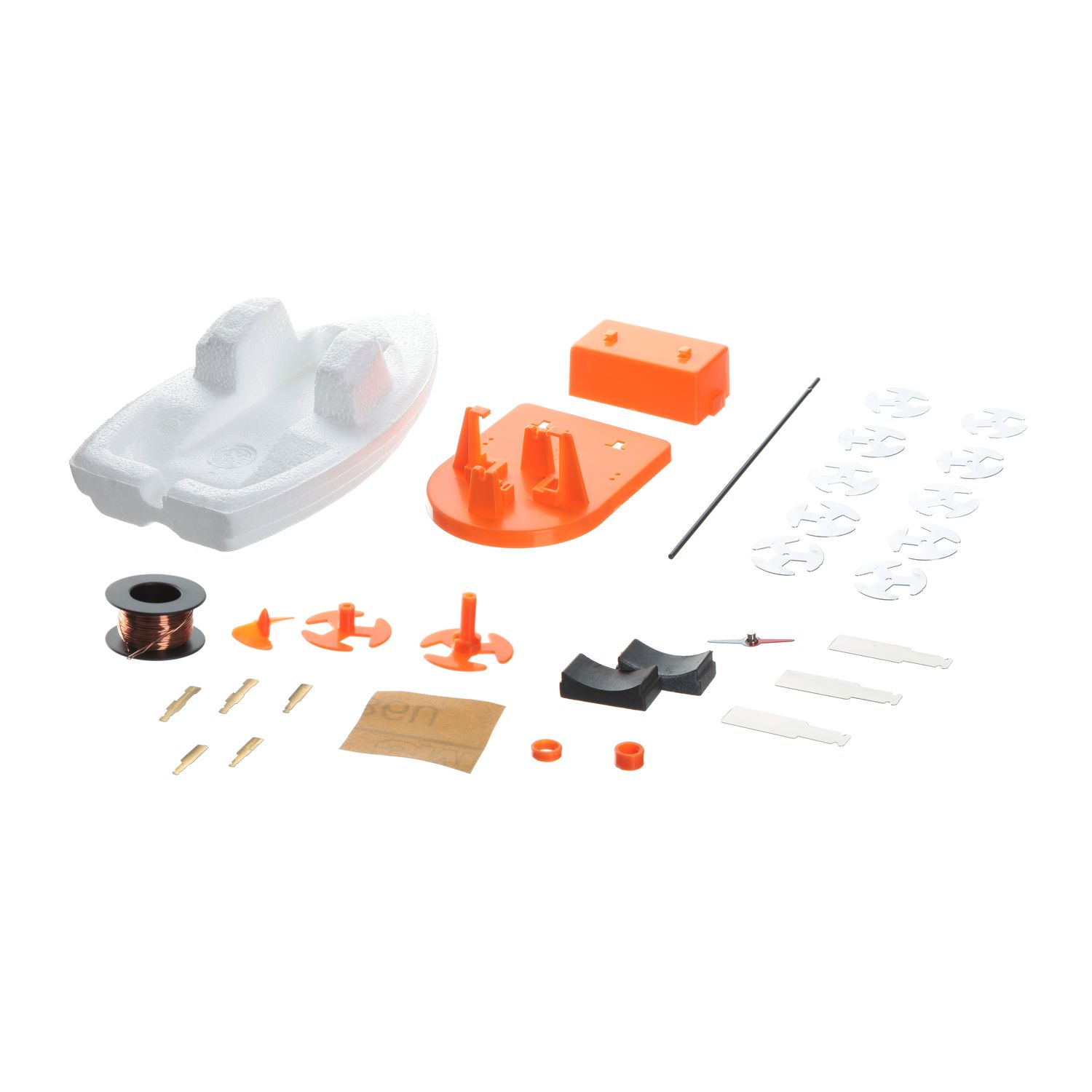 - используя этот набор, ты сможешь построить движущуюся модель лодки, оснащенной настоящим электродвигателем, способным приводить в движение мотор и винт