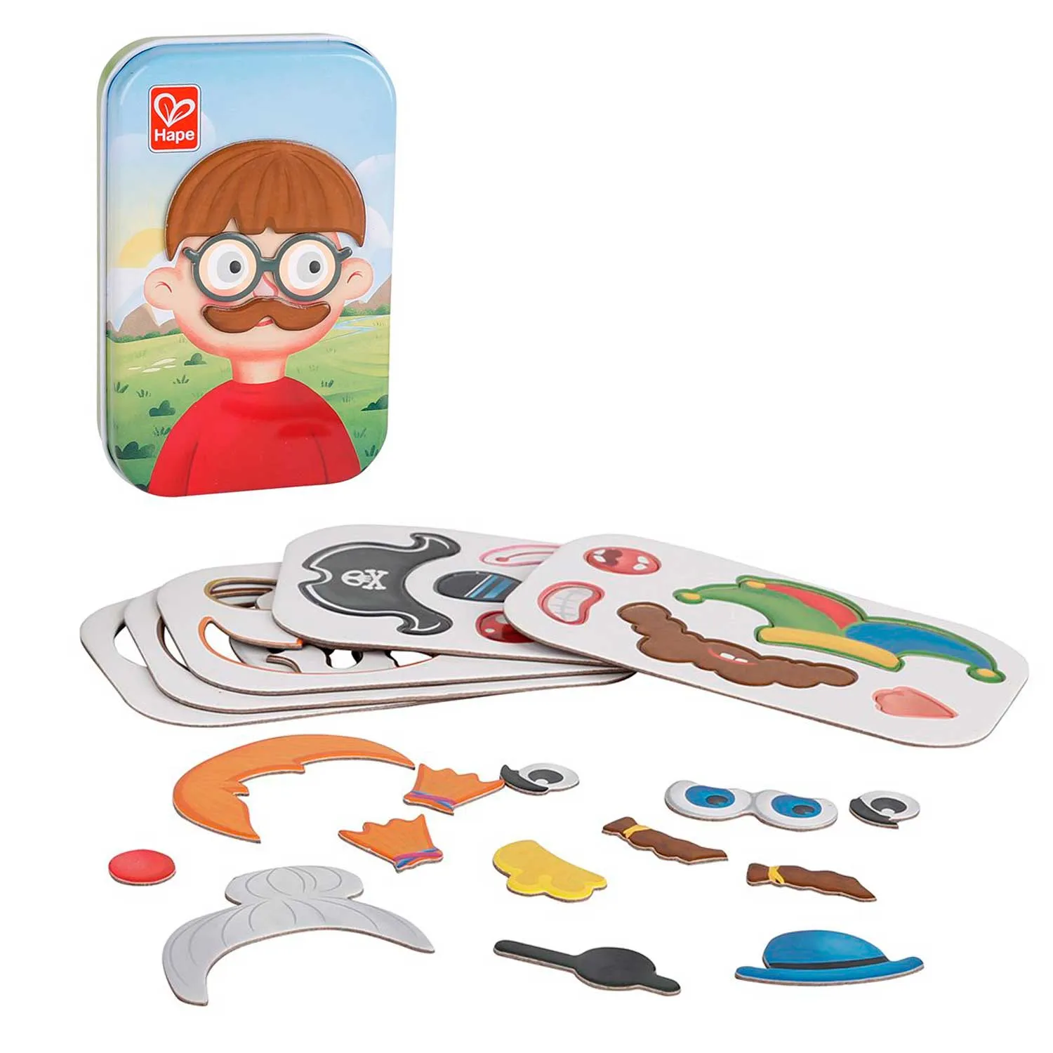 - набор с 29 магнитными элементами, которые можно приклеить, с мужскими и женскими чертами лица, а также с разными шляпами, прическами, очками и многим другим
