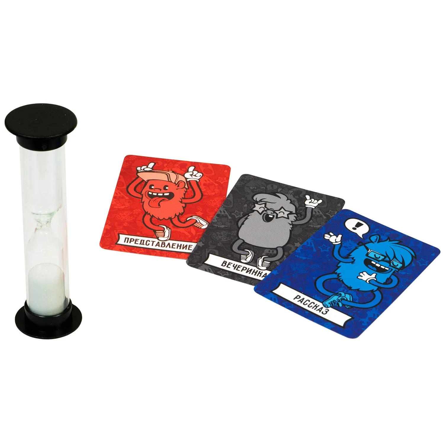 - каждый ход выбирается новый ведущий, который должен объяснить другим слово или словосочетание при помощи рассказа, молчаливого представления или уникального шоу, продиктованного специальной картой