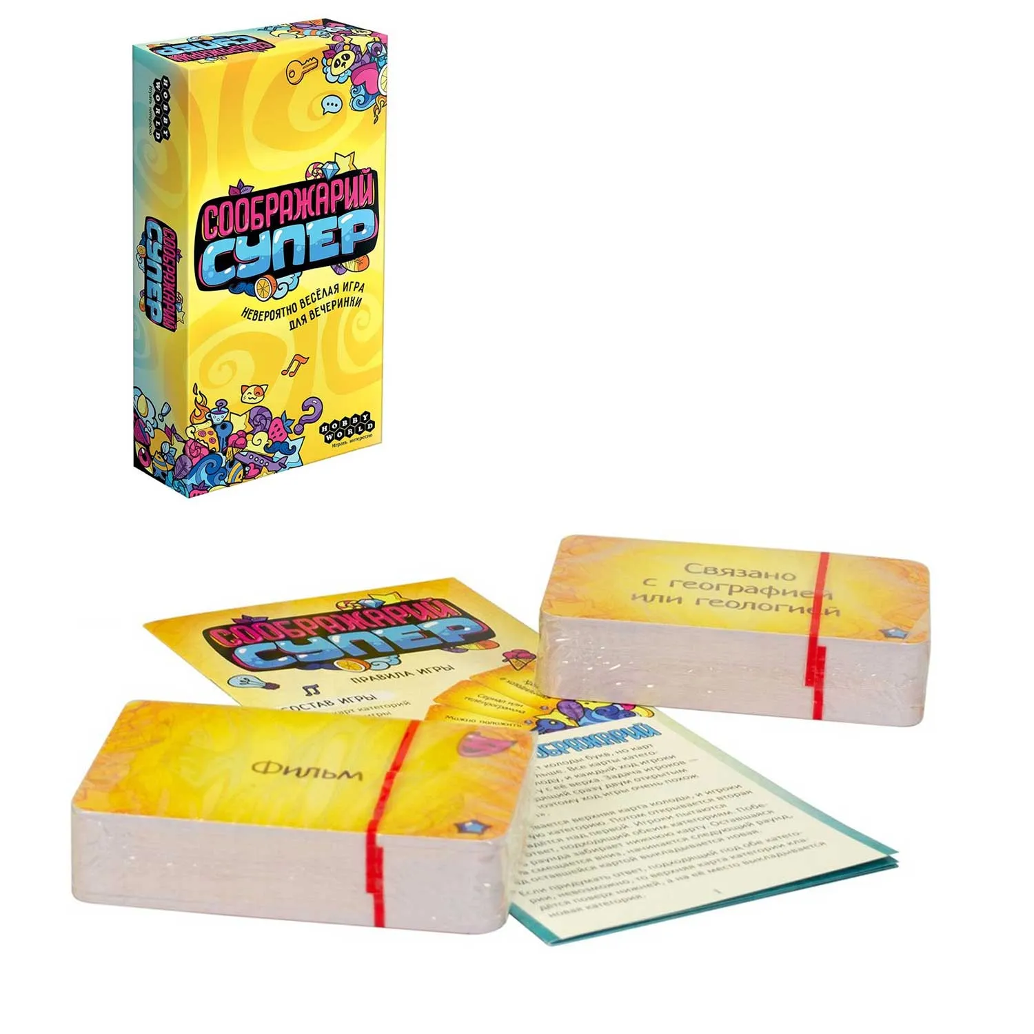 - в версии "Соображарий Супер" вы не найдёте привычной по оригинальному "Соображарию" колоды букв, вместо этого здесь есть увеличившаяся вдвое стопка карт категорий