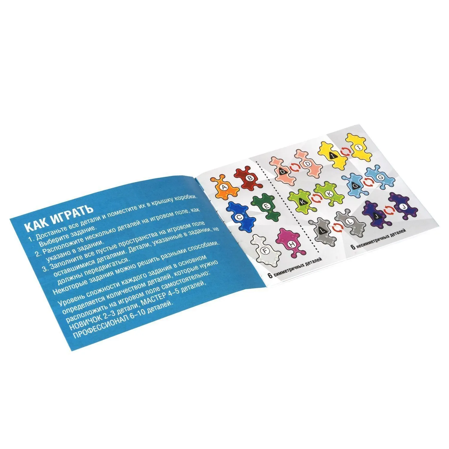 - правила игры: расположи несколько 3Д деталей как указано в задании. Заполни все пустые пространства на игровом поле оставшимися деталями таким образом, чтобы получилось плоское двухмерное изображение