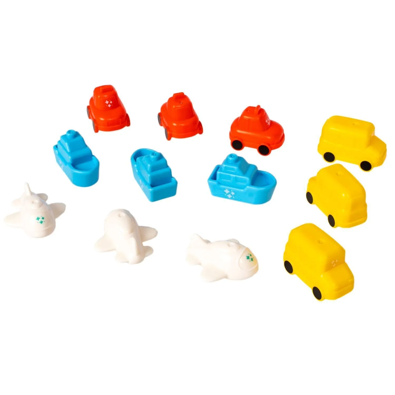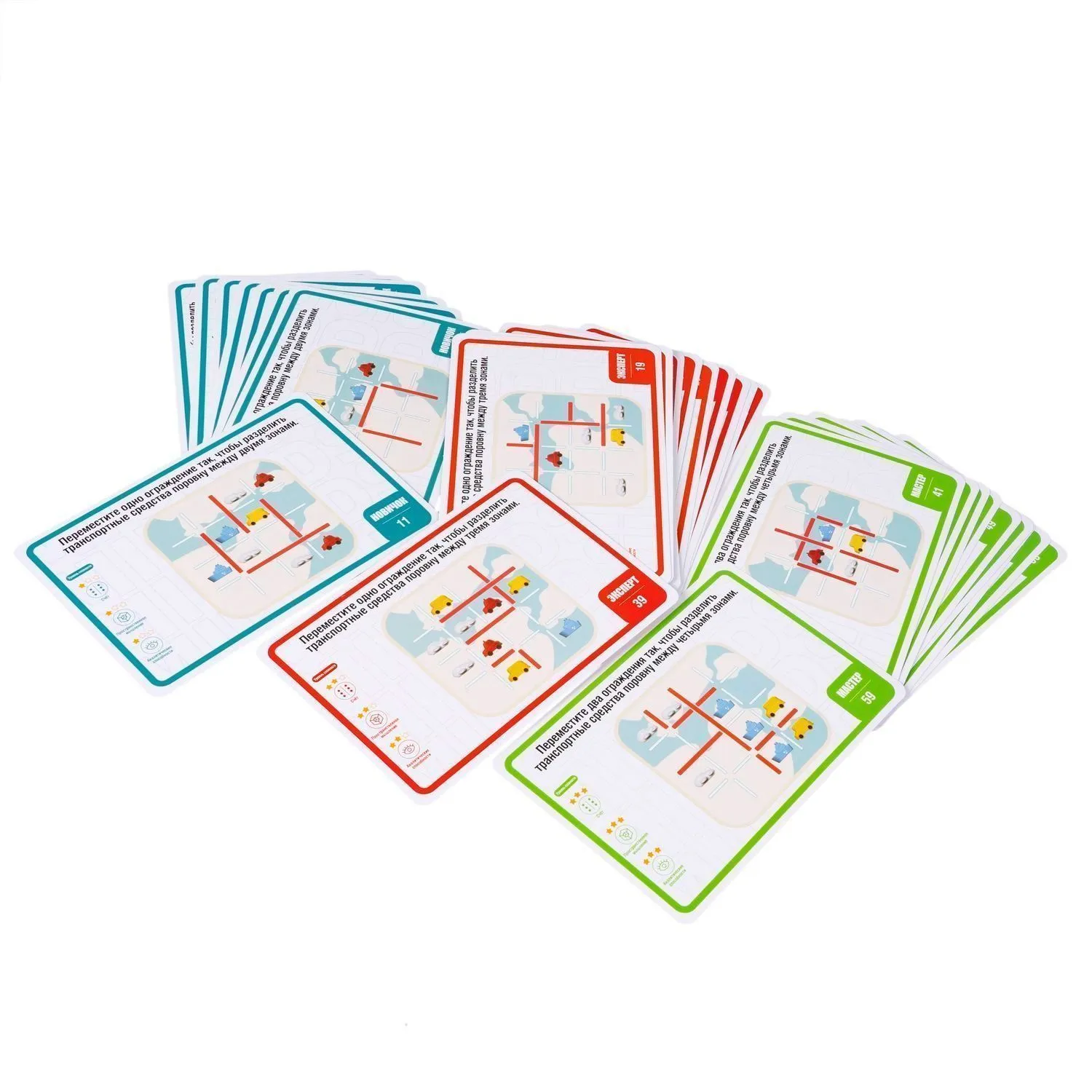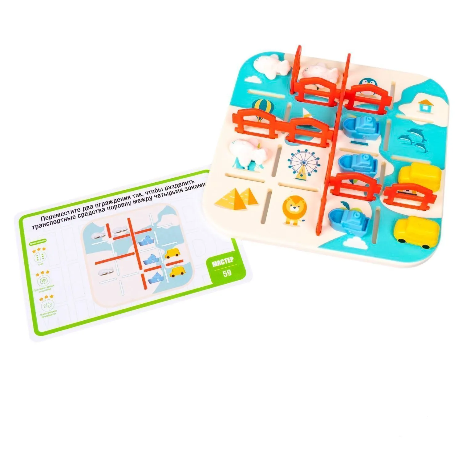 - выберите карточку и расставьте машинки, корабли, самолеты и ограждения, как показано в задании, затем переместите указанное количество частей забора и попытайтесь поровну распределить транспортные средства между зонами
