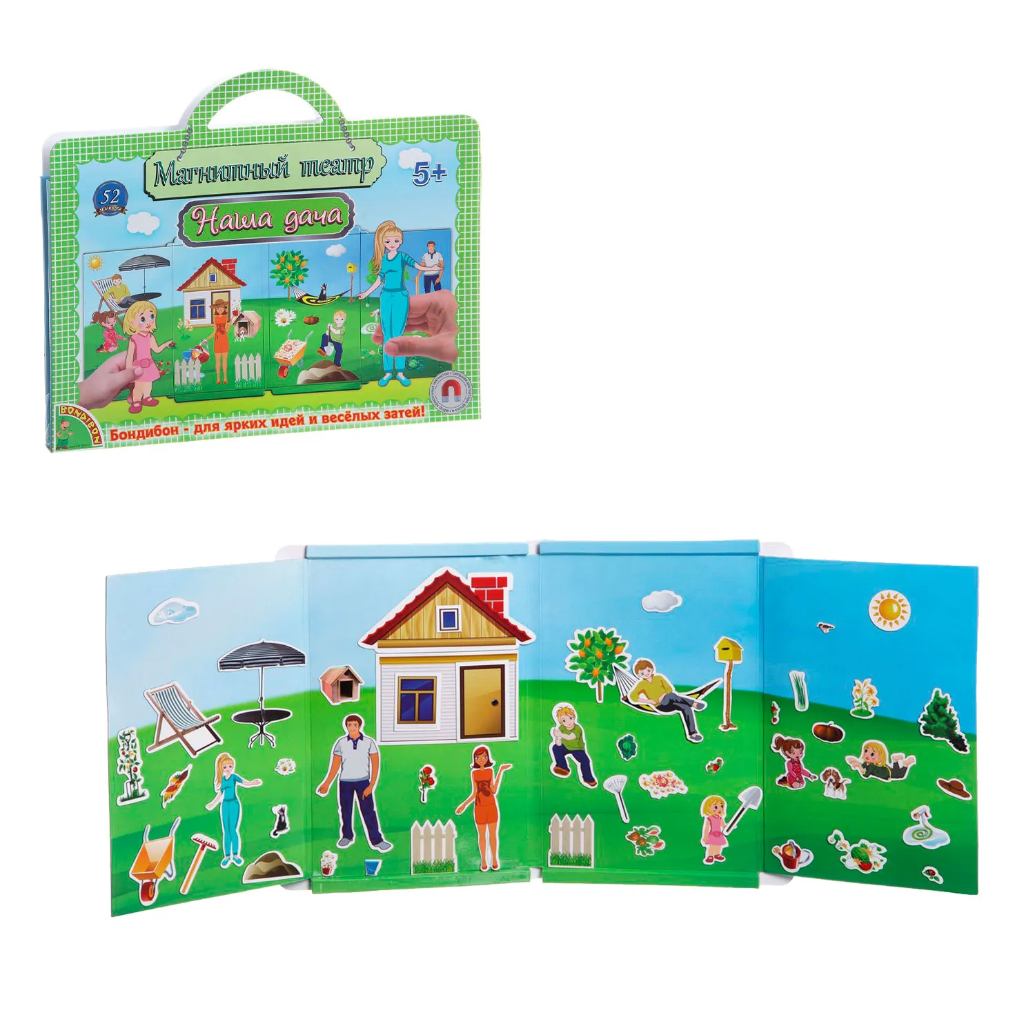 - набор из 52 красочных магнитных элемента с изображением разнообразных героев, деталей природы, предметов обихода