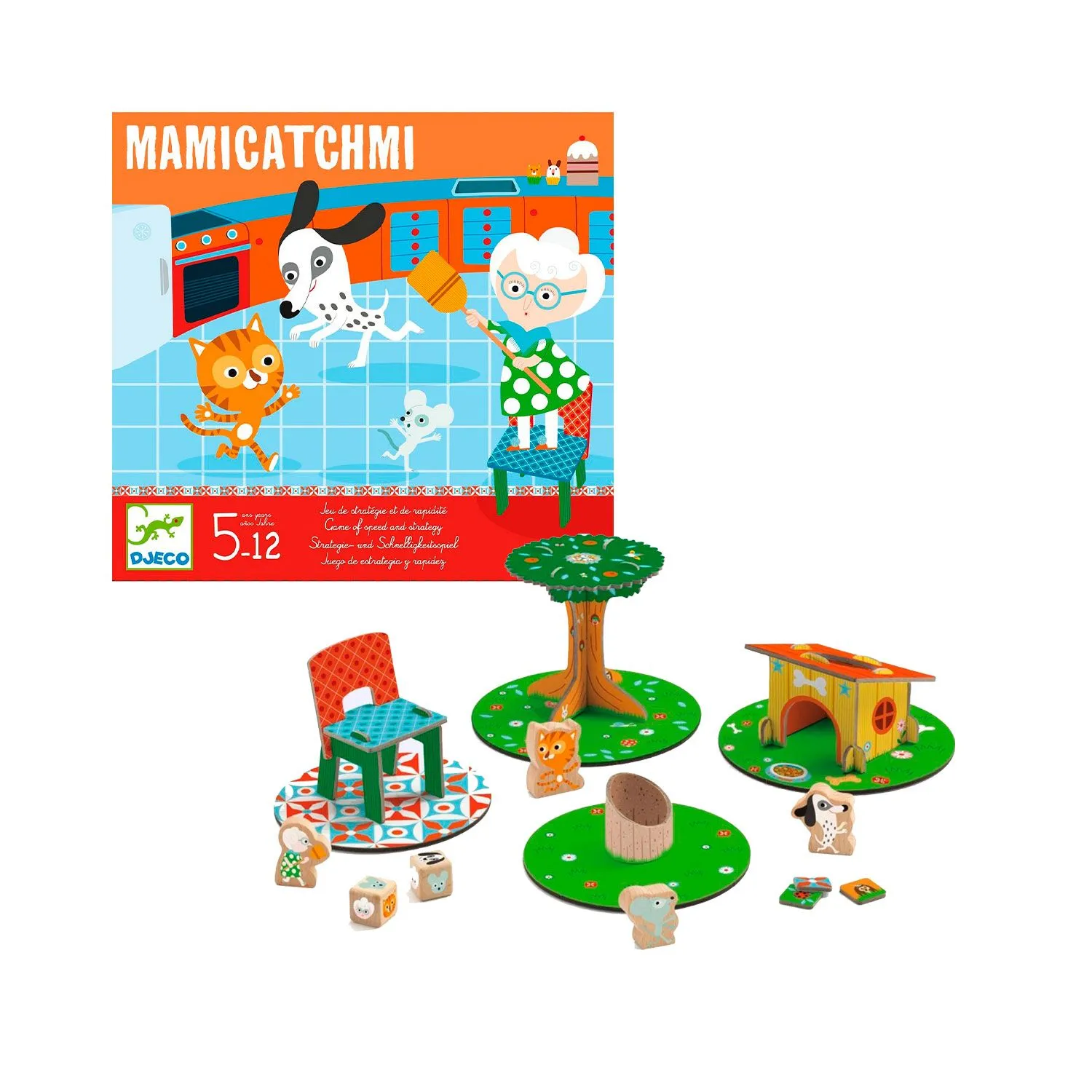 Настольная игра от известной французской компании «Djeco» предлагает детям устроить настоящую погоню с участием забавных персонажей, изображенных на деревянных фишках: бабушки, мышки, котика и собачки.
