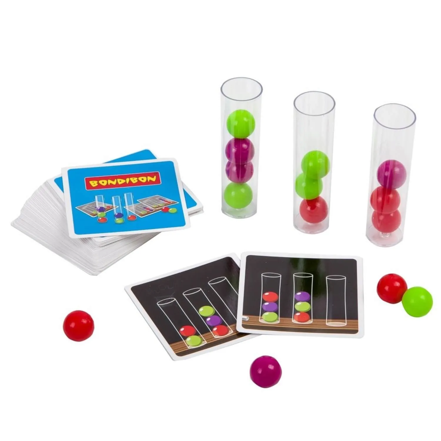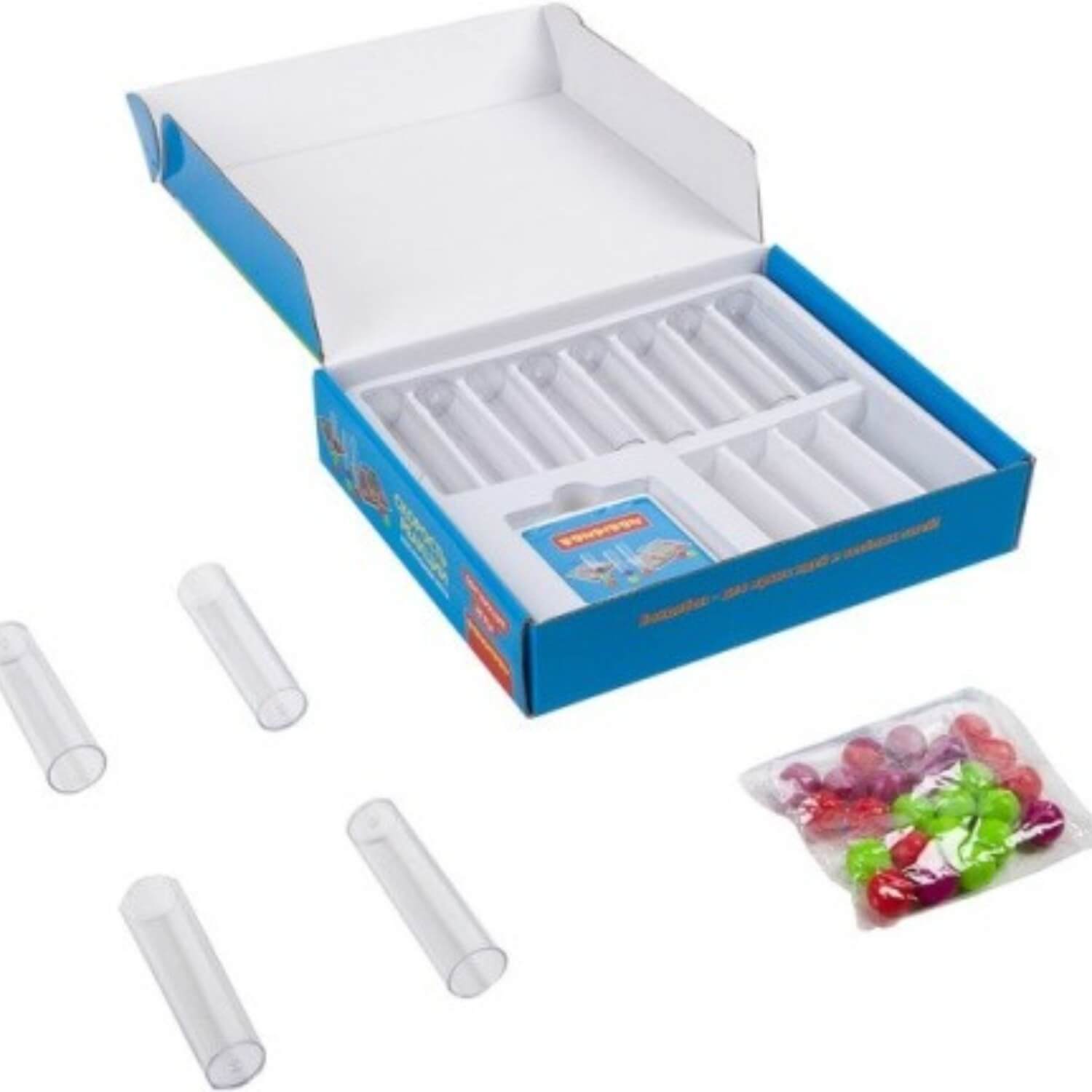 - собери наибольшее количество карт, выполнив задания на скорость: повторяй комбинацию, указанную на карте-задании, перекатывая шарики из одной колбы в другую