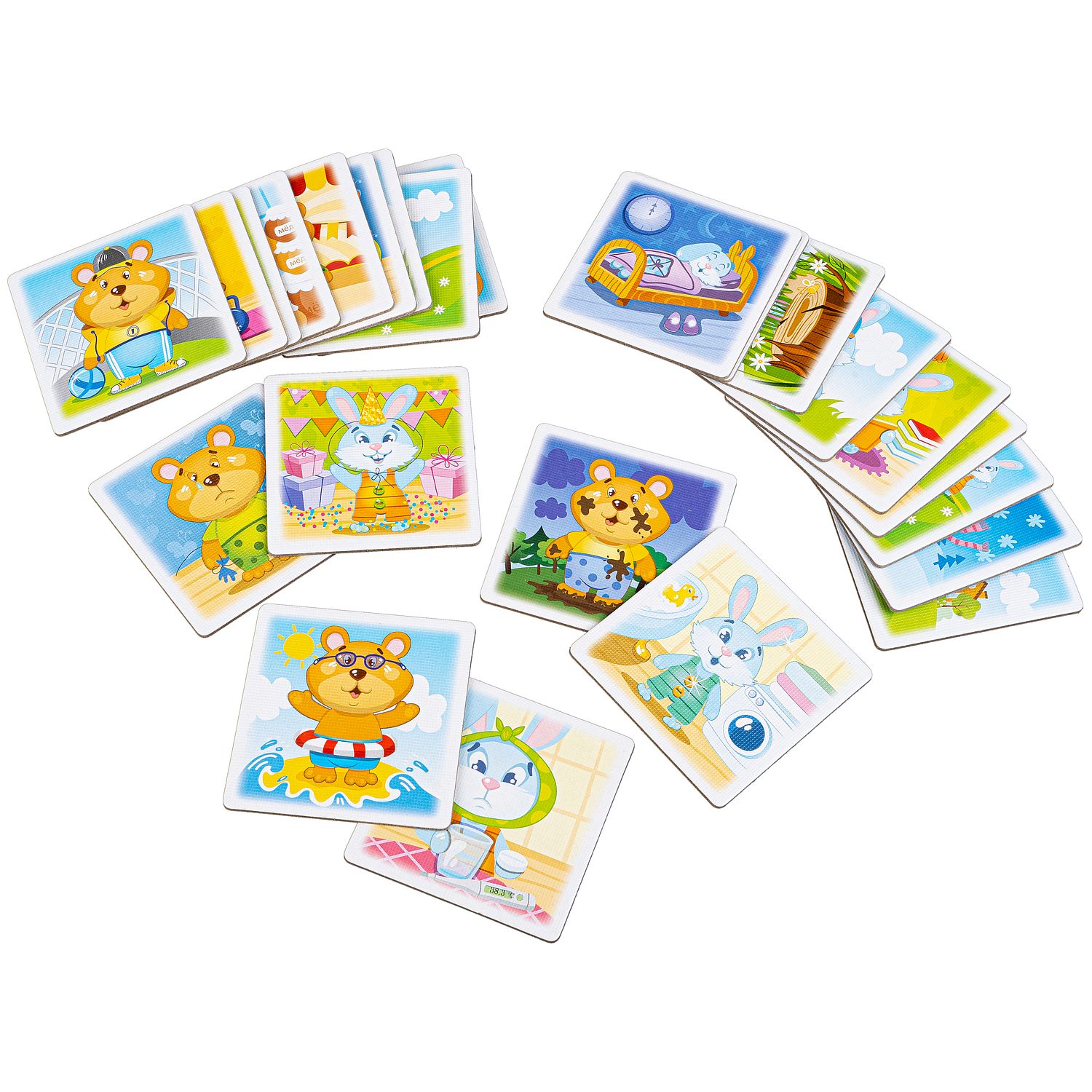 - разложите карточки с медвежонком изображениями вверх, а карточки с зайчиком изображениями вниз