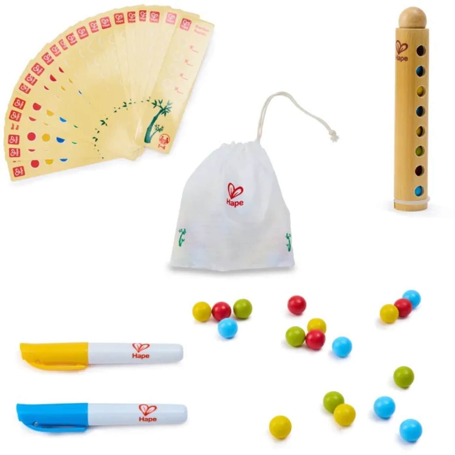 - в комплекте: 4 бамбуковые трубки, 40 деревянных бусин, 1 изолирующий шнур, 4 маленьких маркера, 72 карточки с заданиями, 1 хлопчатобумажный пакетик
