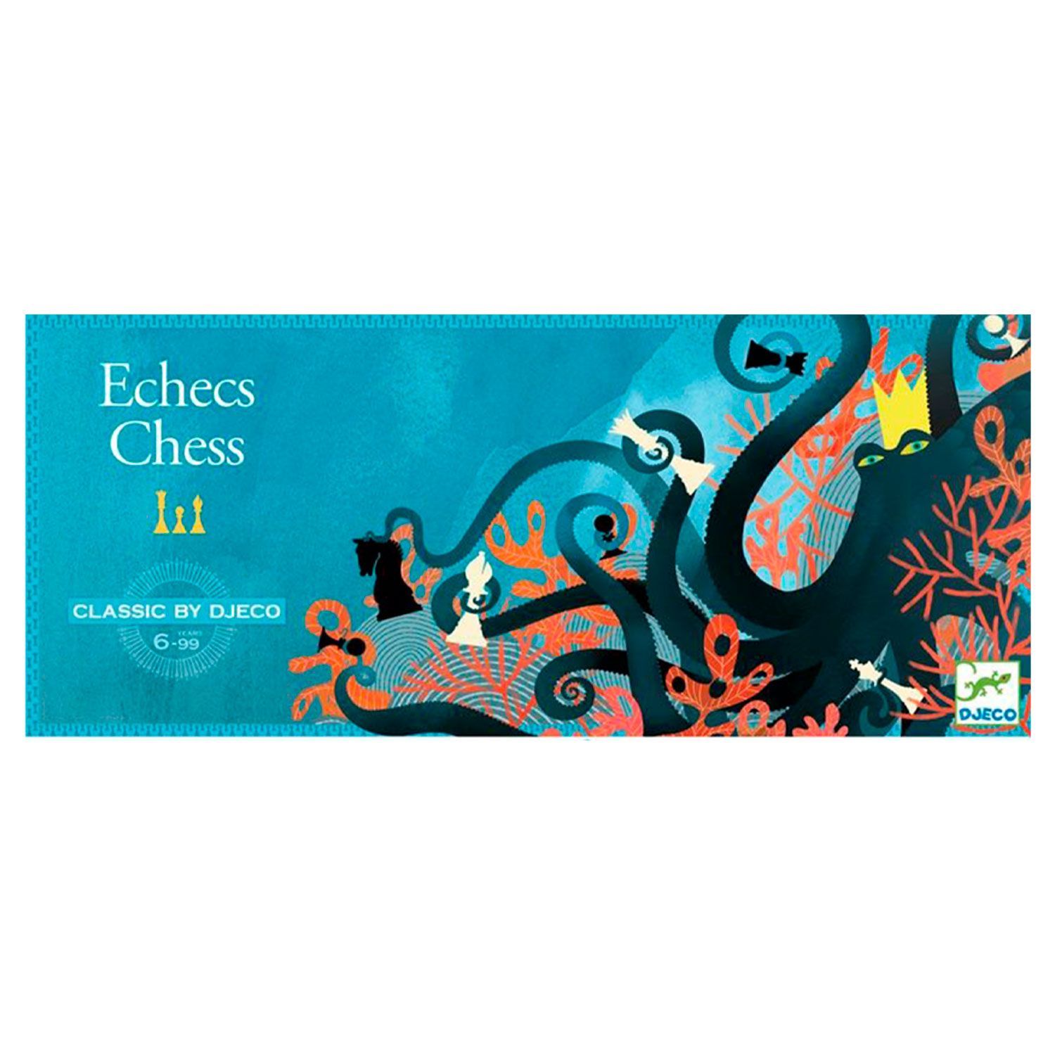 В нем представлены не только привычные деревянные фигурки, но и красочное игровое поле с классическими черно-белыми квадратиками, дополненное красивыми витиеватыми узорами.