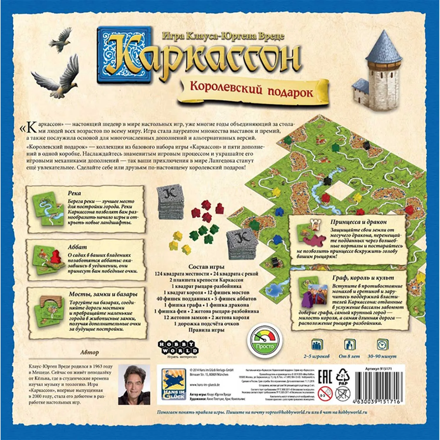 - набор включает в себя базовый средневековый "Каркассон", а также расширенный набор дополнений: "Река", "Аббат", "Мосты, замки и базары", "Принцесса и дракон", "Граф, король и культ"