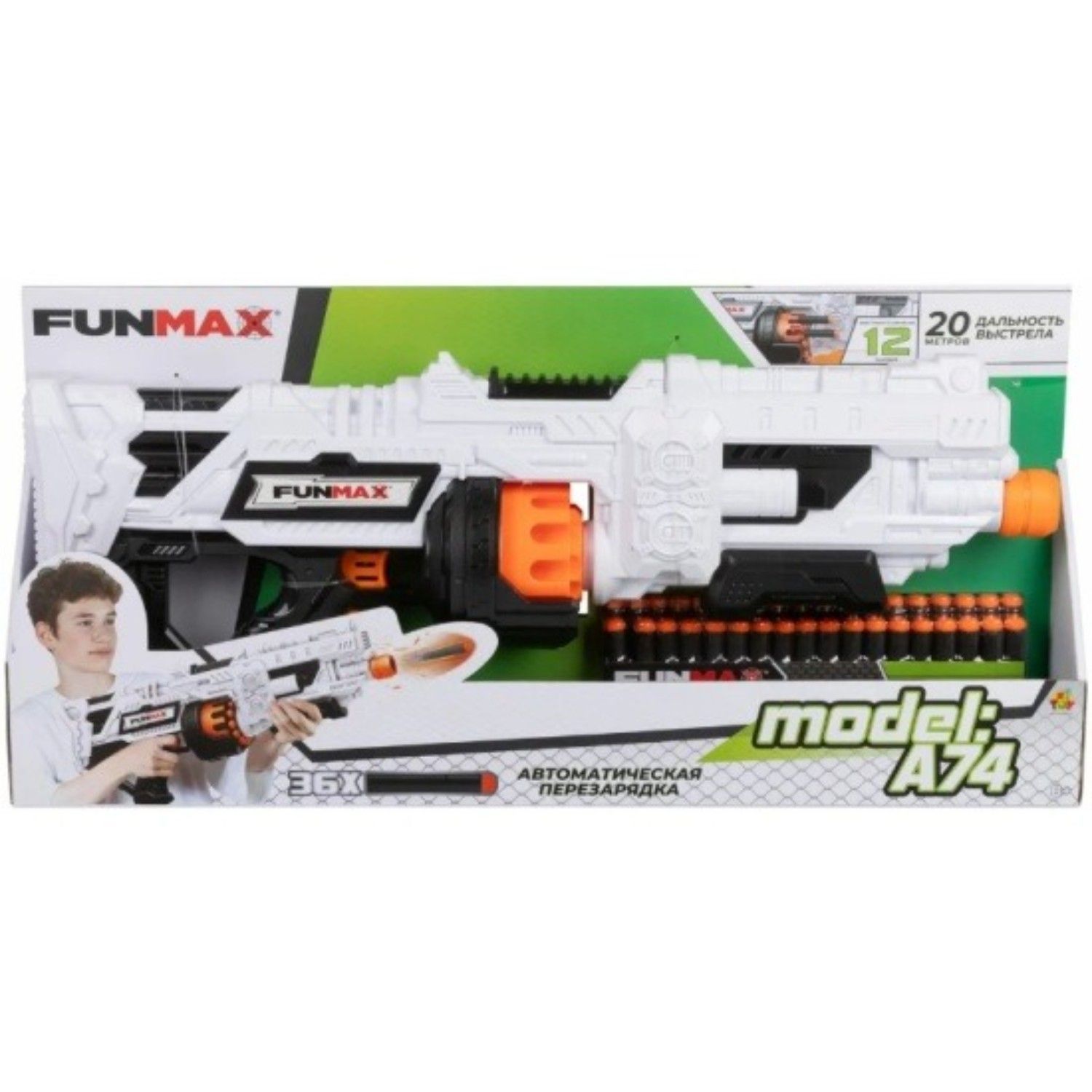- бластер Funmax А74 оснащён электромеханическим механизмом стрельбы
