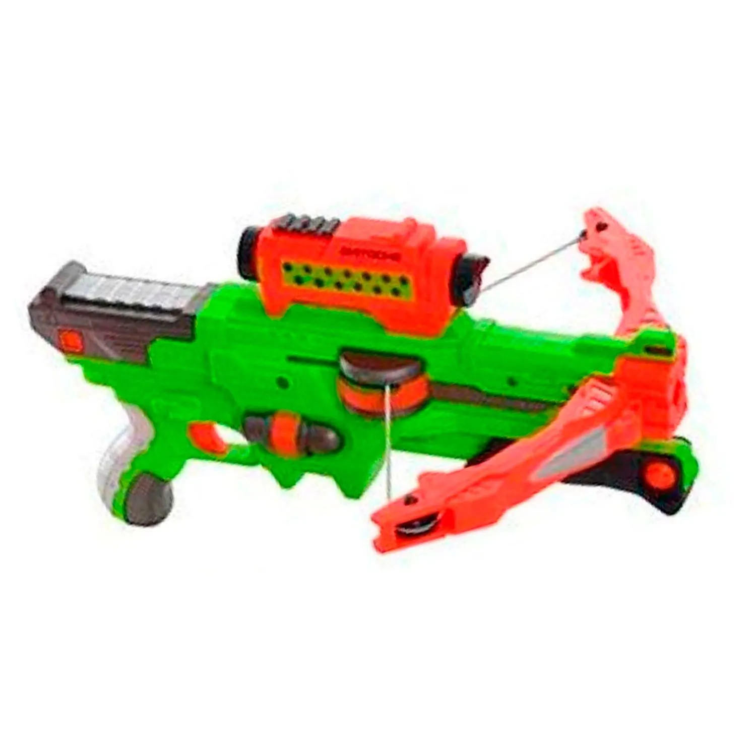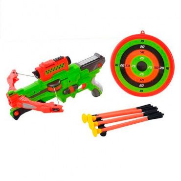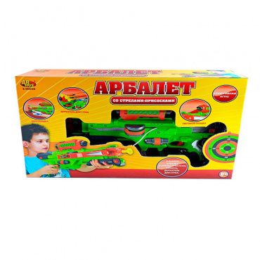 Мощный и стильный арбалет выполнен в ярко-зеленом цвете с оранжевыми и серыми вставками. Он удобно держится в руках, имеет держатель для стрел и световой прицел.
