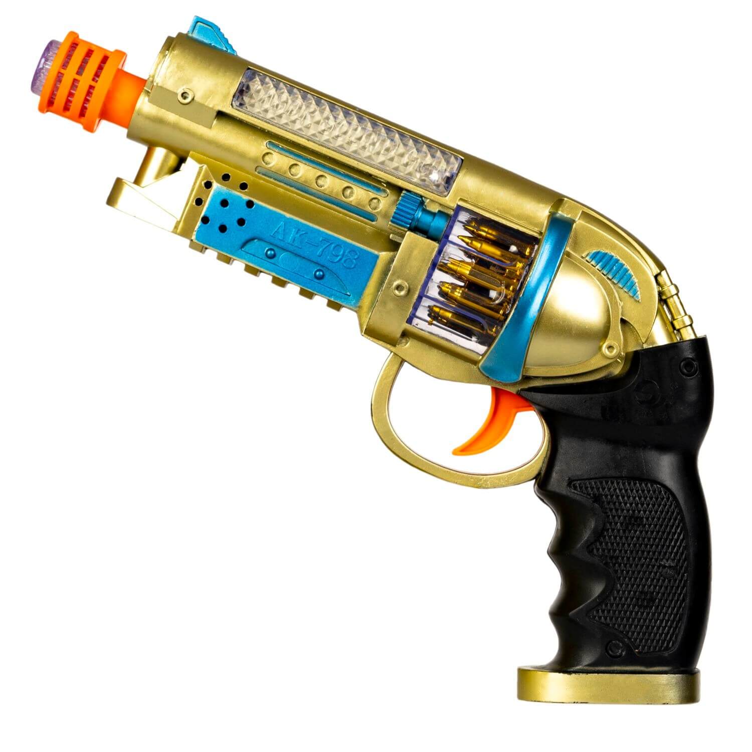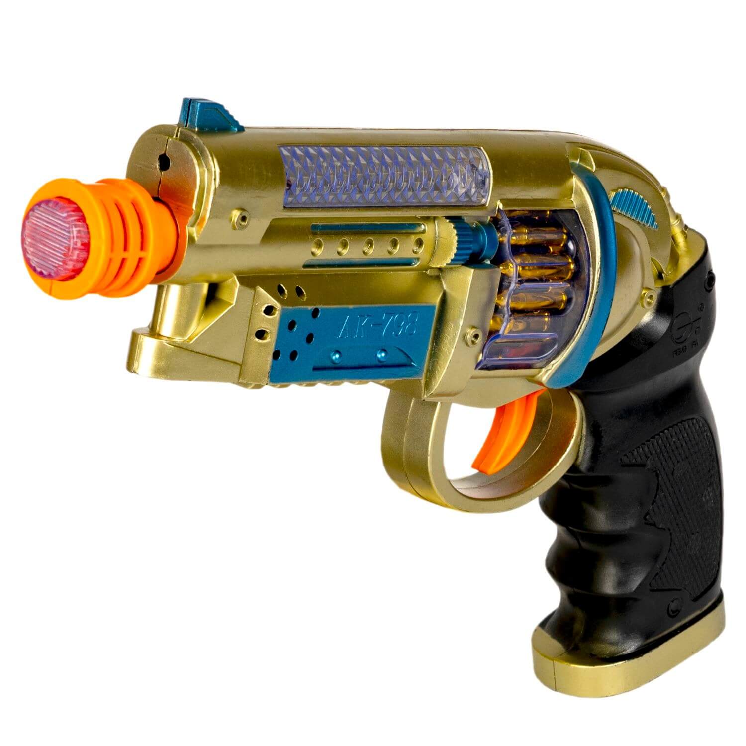 - пистолет светится, стреляет с межгалактическими звуками и спецэффектами