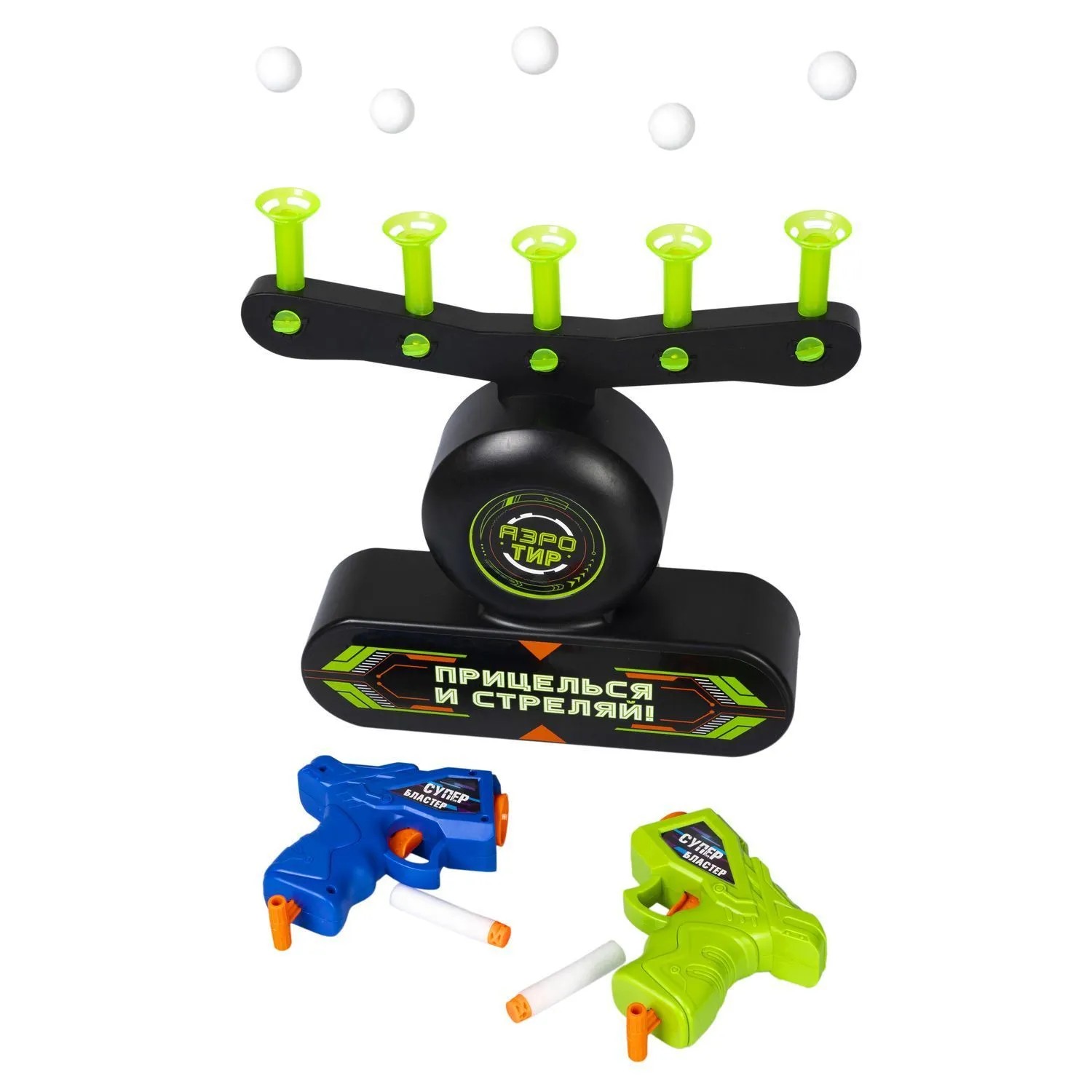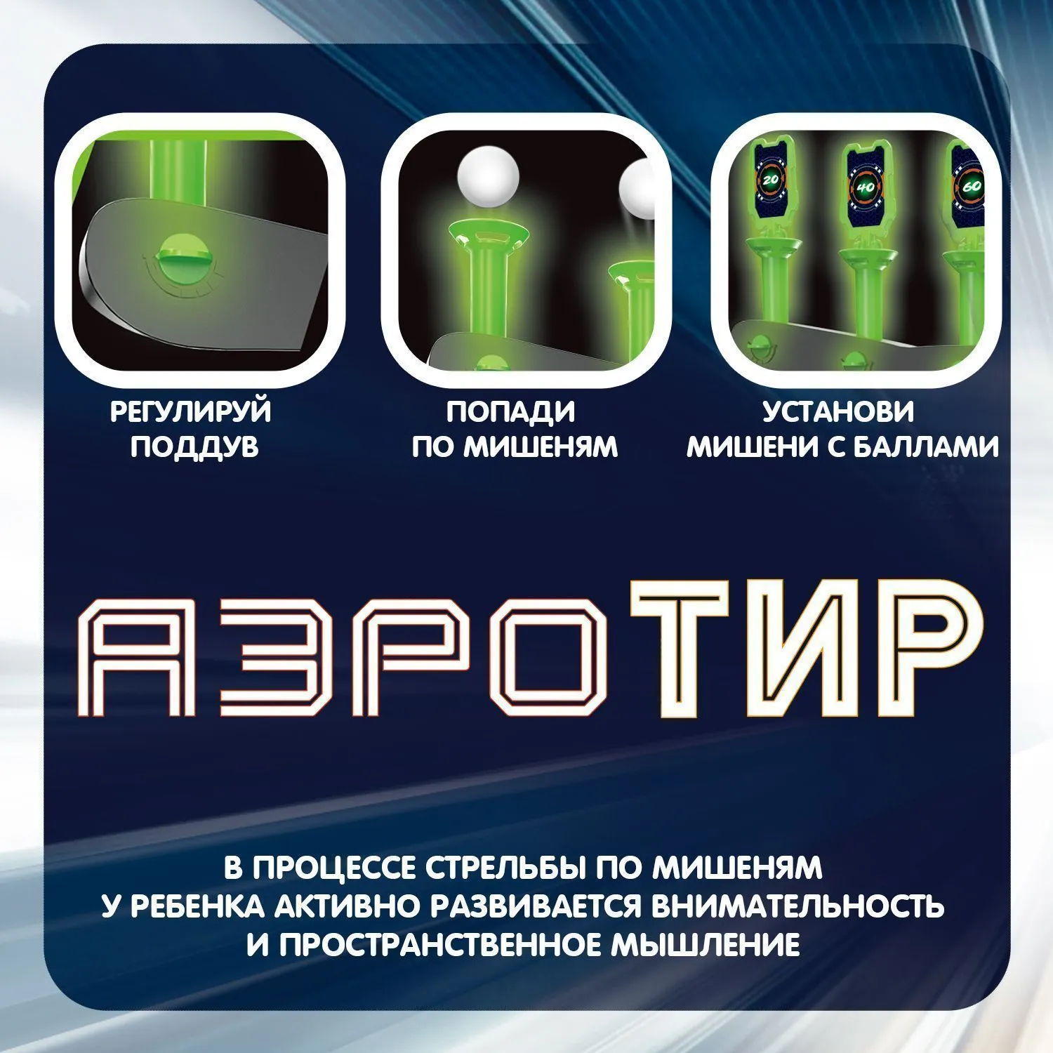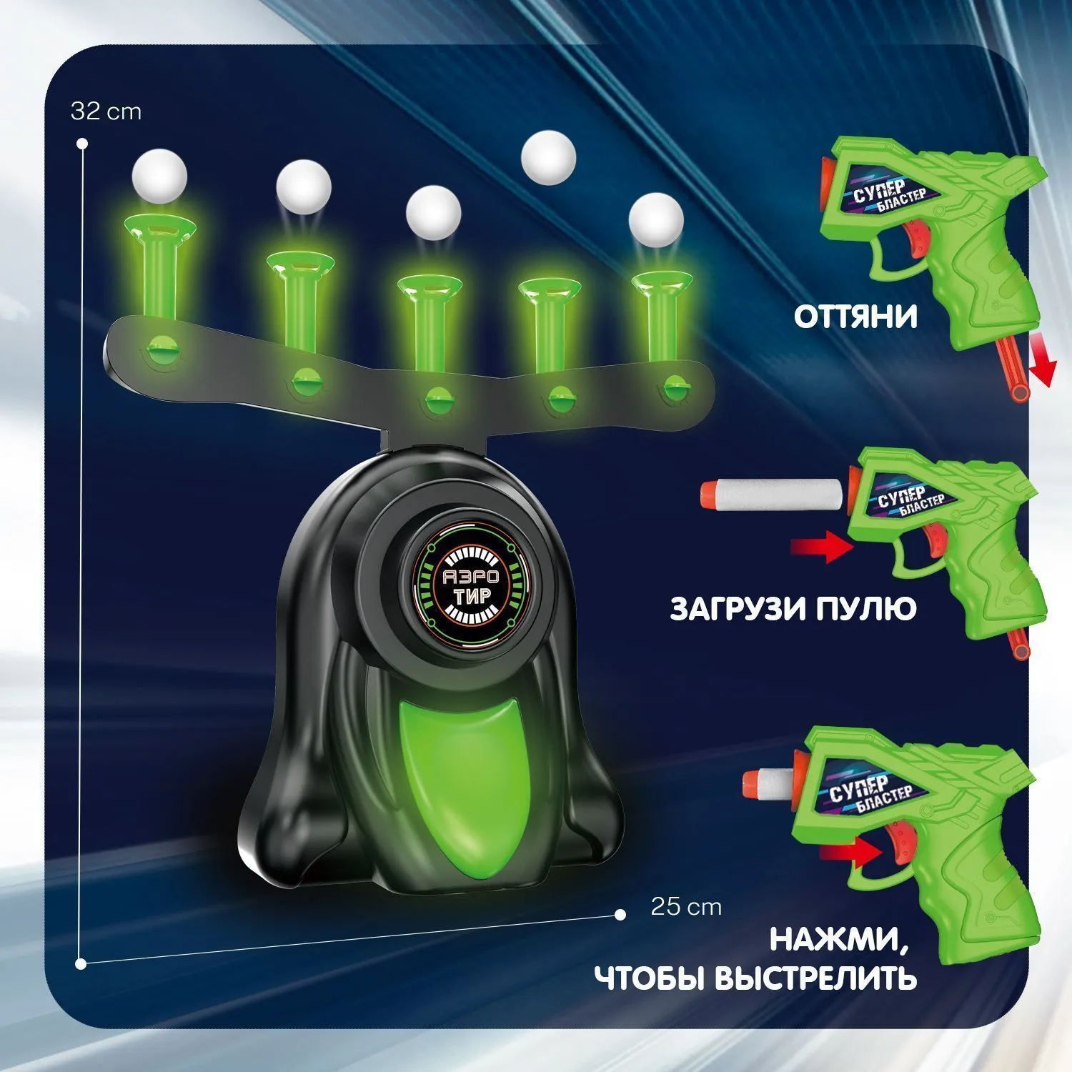 Возможность создать домашний тир – разве это не мечта? Перед Вами - необыкновенный игровой набор "АЭРОТИР" с парящими шариками, 5-ю мишенями и зеленой подсветкой и двумя бластерами!
