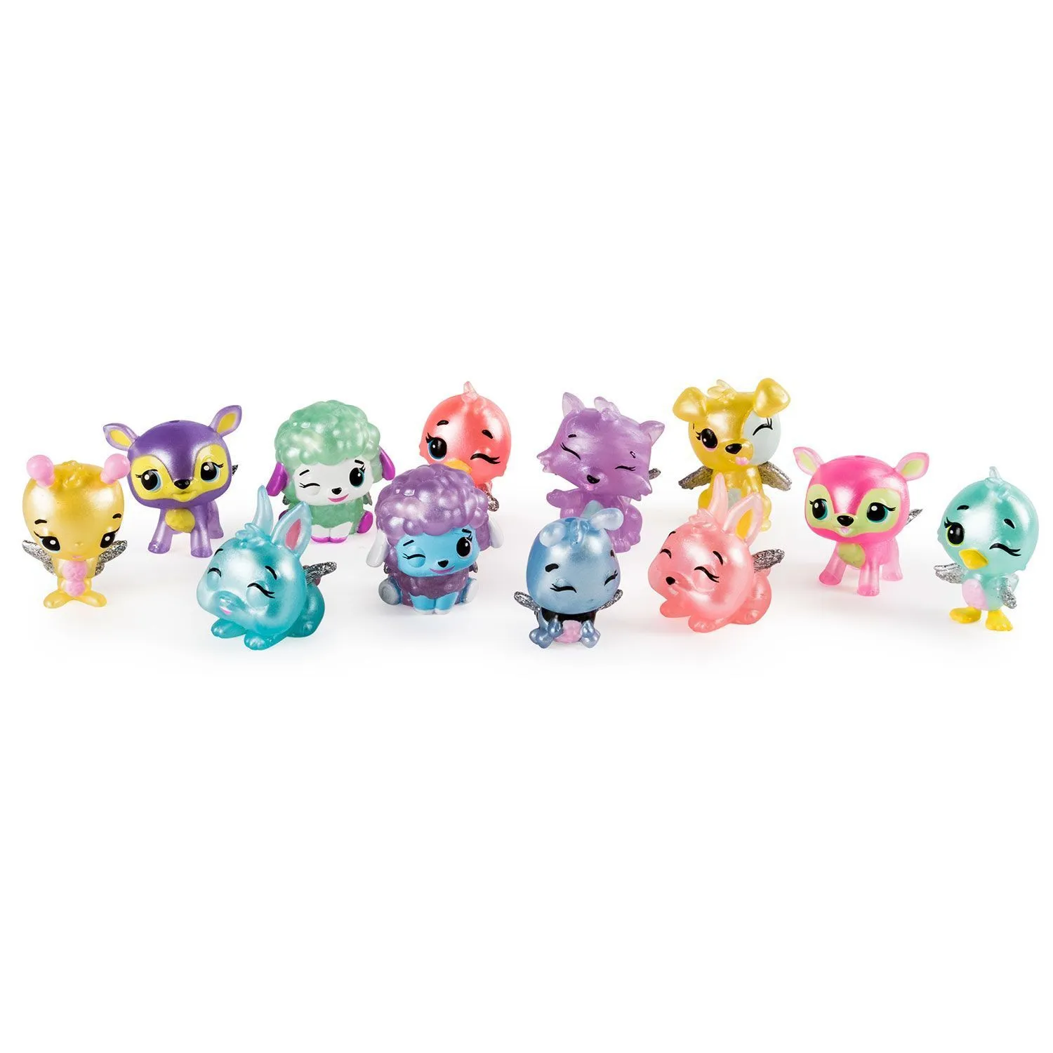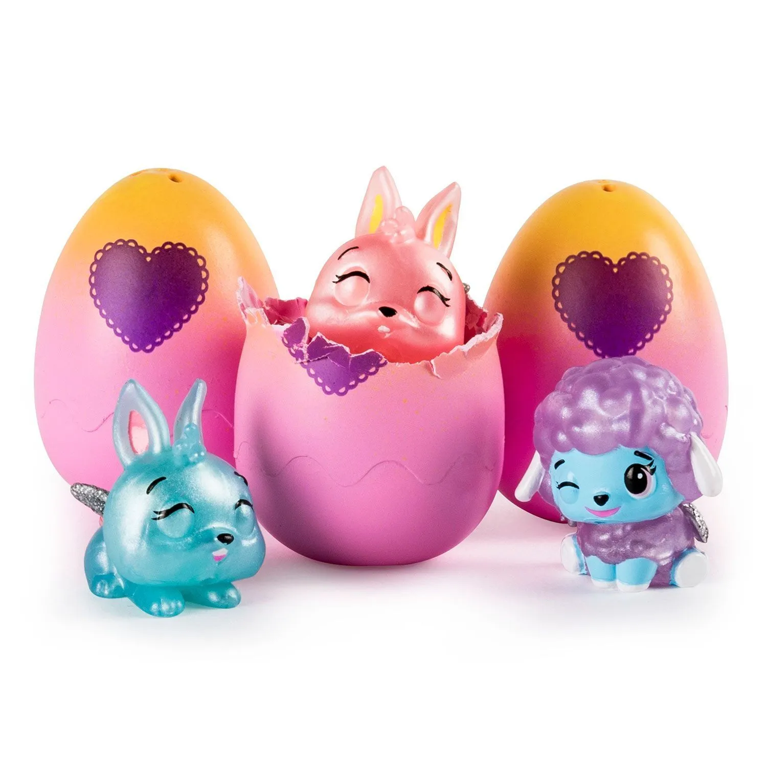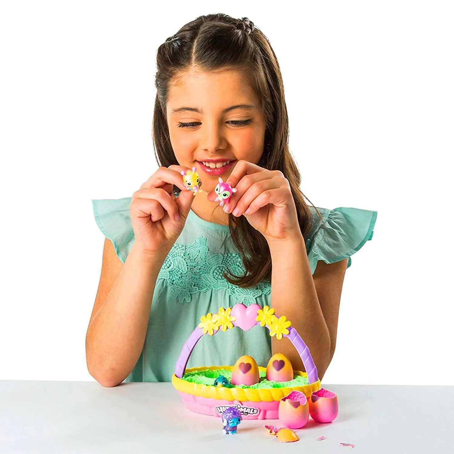 - корзинка выглядит очень ярко, ее удобная ручка украшена желтыми цветочками и нежно-розовым сердечком, а внутри между зеленой травкой спрятаны 2 вылупившихся зверка с переливающийся, блестящей шерсткой и 4 ярких яйца с градиентной расцветкой и фиолетовыми сердечками, внутри которых тоже спрятаны питомцы