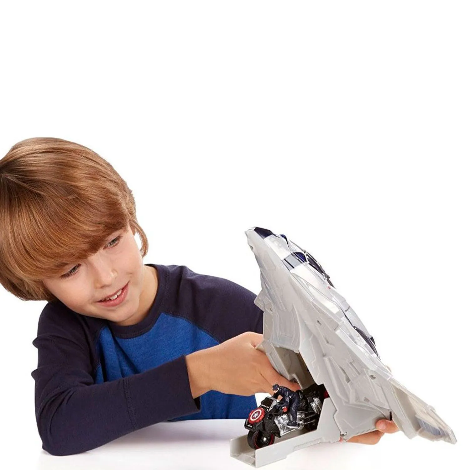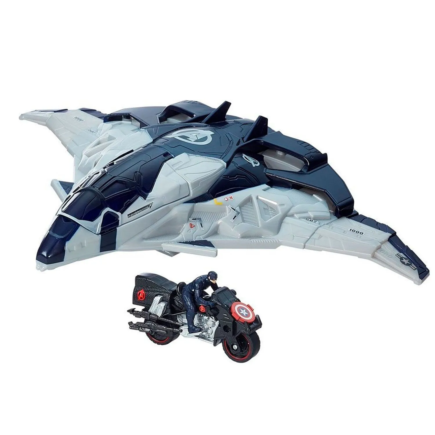 - если ребенок нажмет на кнопки, расположенные на корпусе истребителя, то откроется грузовой отсек, в который легко поместится мотоцикл Капитана Америки
