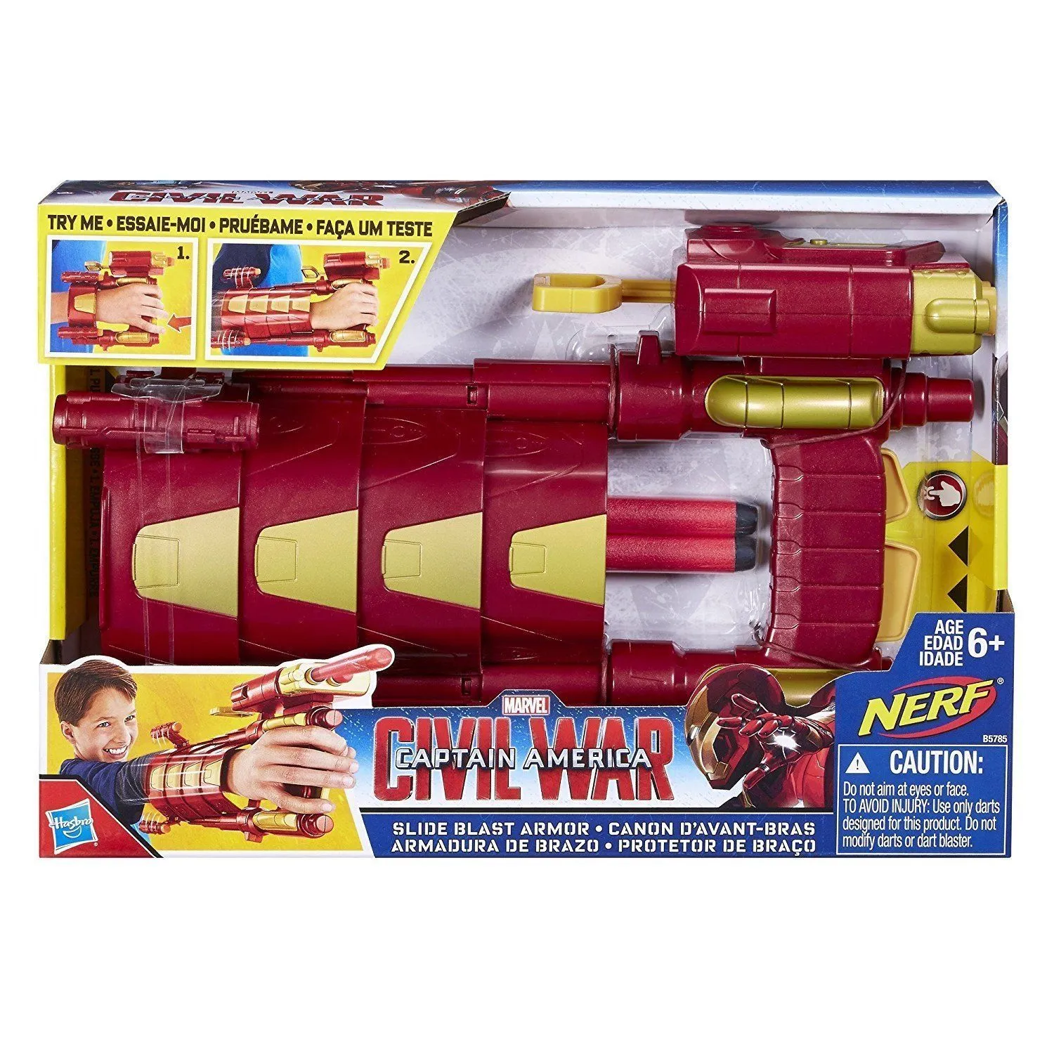 Бластер-броня Железного Человека выполнен в соответствующем красном цвете с добавлением золотистых элементов.