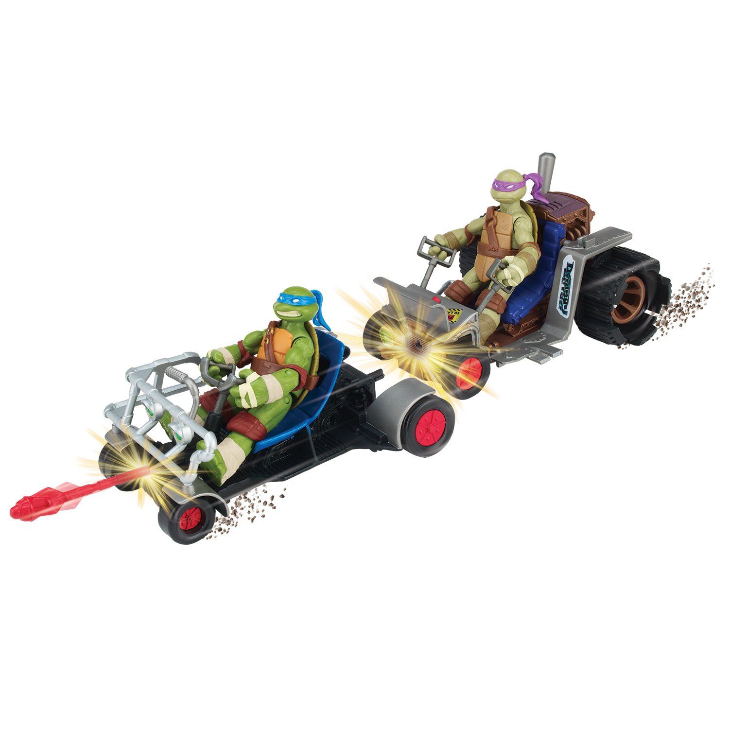 - с помощью нажатия рычага багги Донателло запускает патрульную багги Леонардо, и та с ускорением мчится навстречу неприятелю