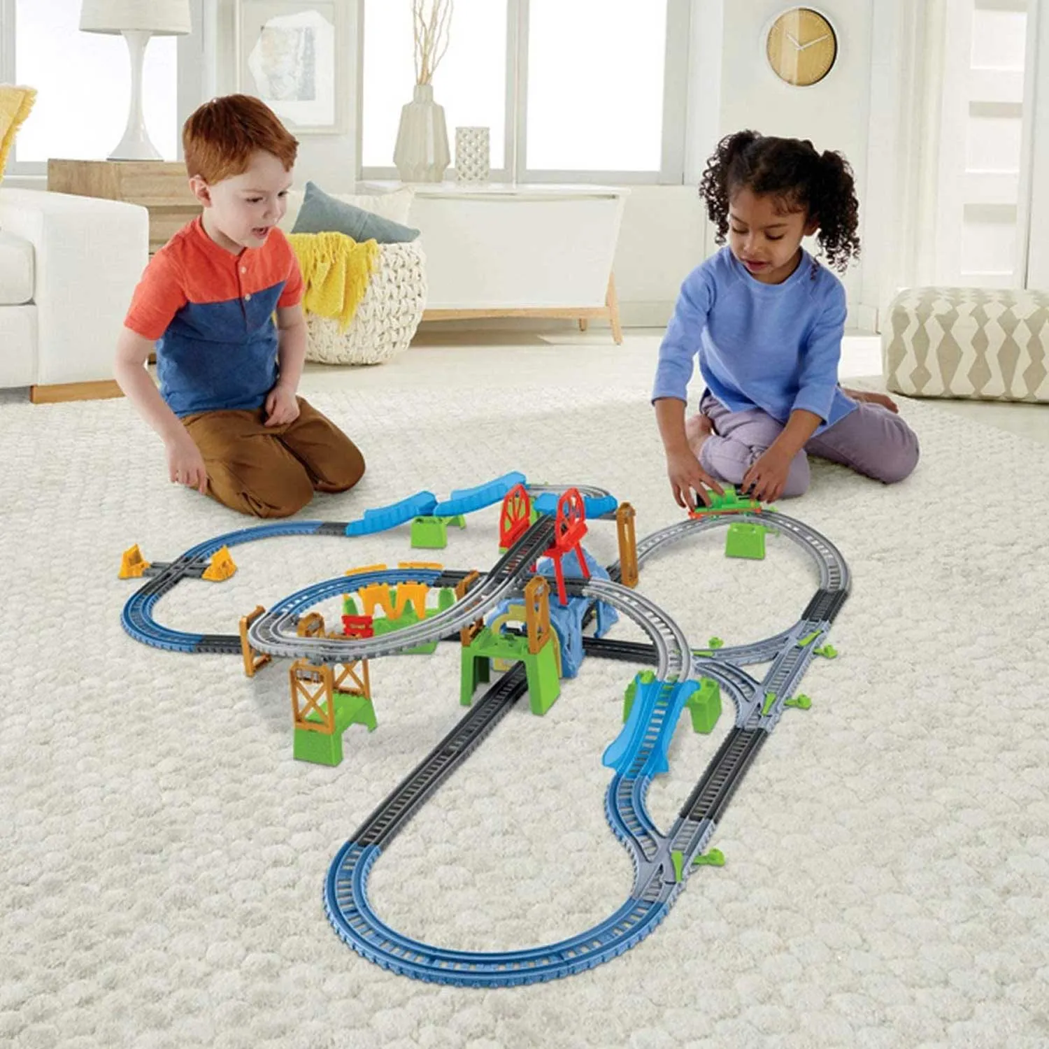 - дорога быстро и удобно раскладывается и собирается, а паровозик может ехать не только по рельсам, но и по любой гладкой поверхности