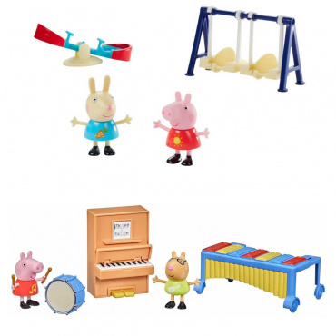 - в игровой набор "Детская площадка" входят фигурки свинки Пеппы и кролика Ребекки, качели а также различные аксессуары