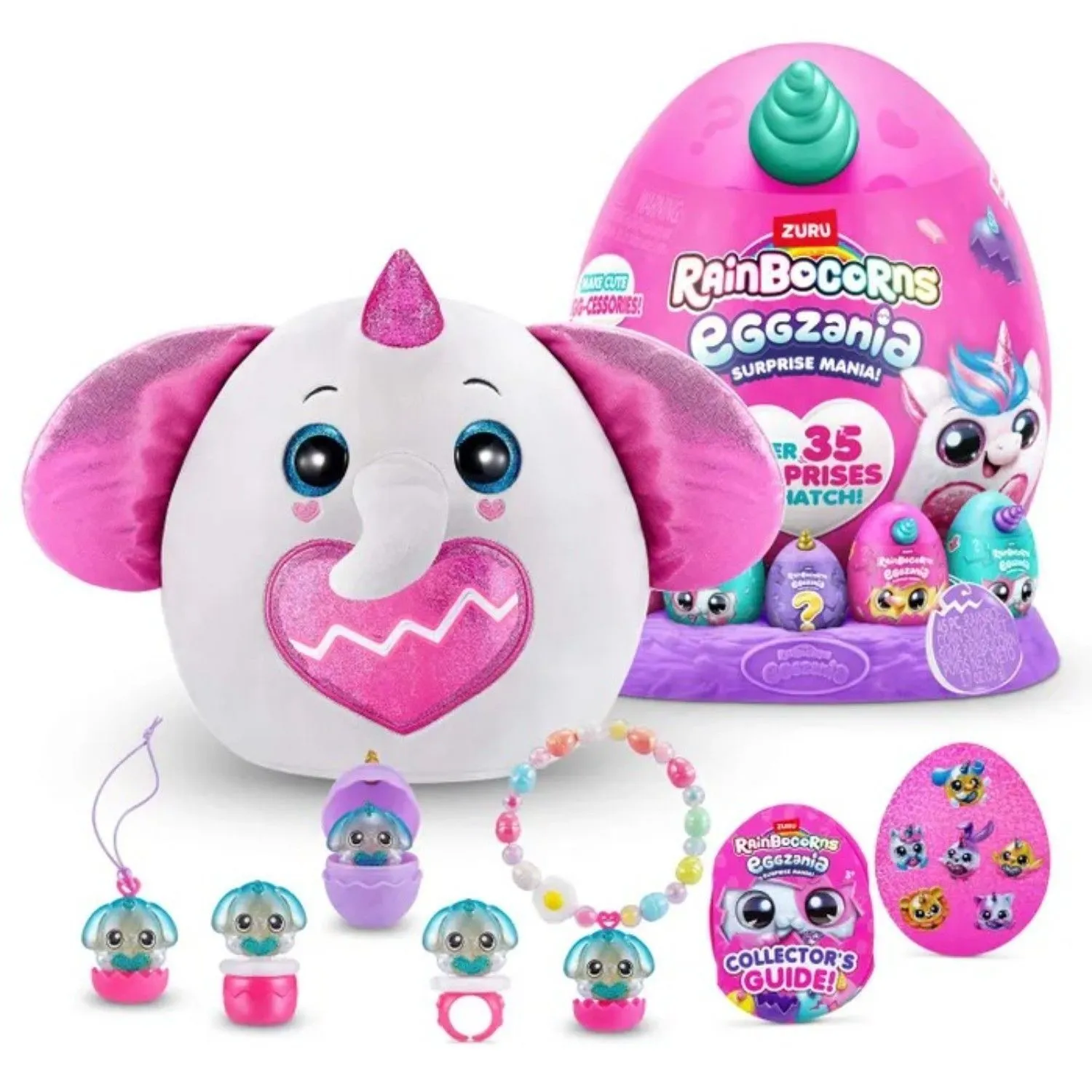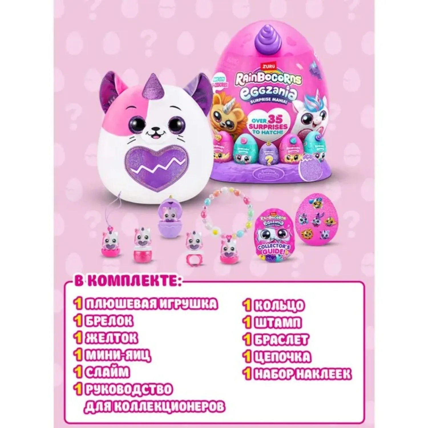 - каждый плюш Eggzania идёт в комплекте с соответствующим желтком, 5 мини-яйцами, наклейками, аксессуарами и шуткой про Eggzania