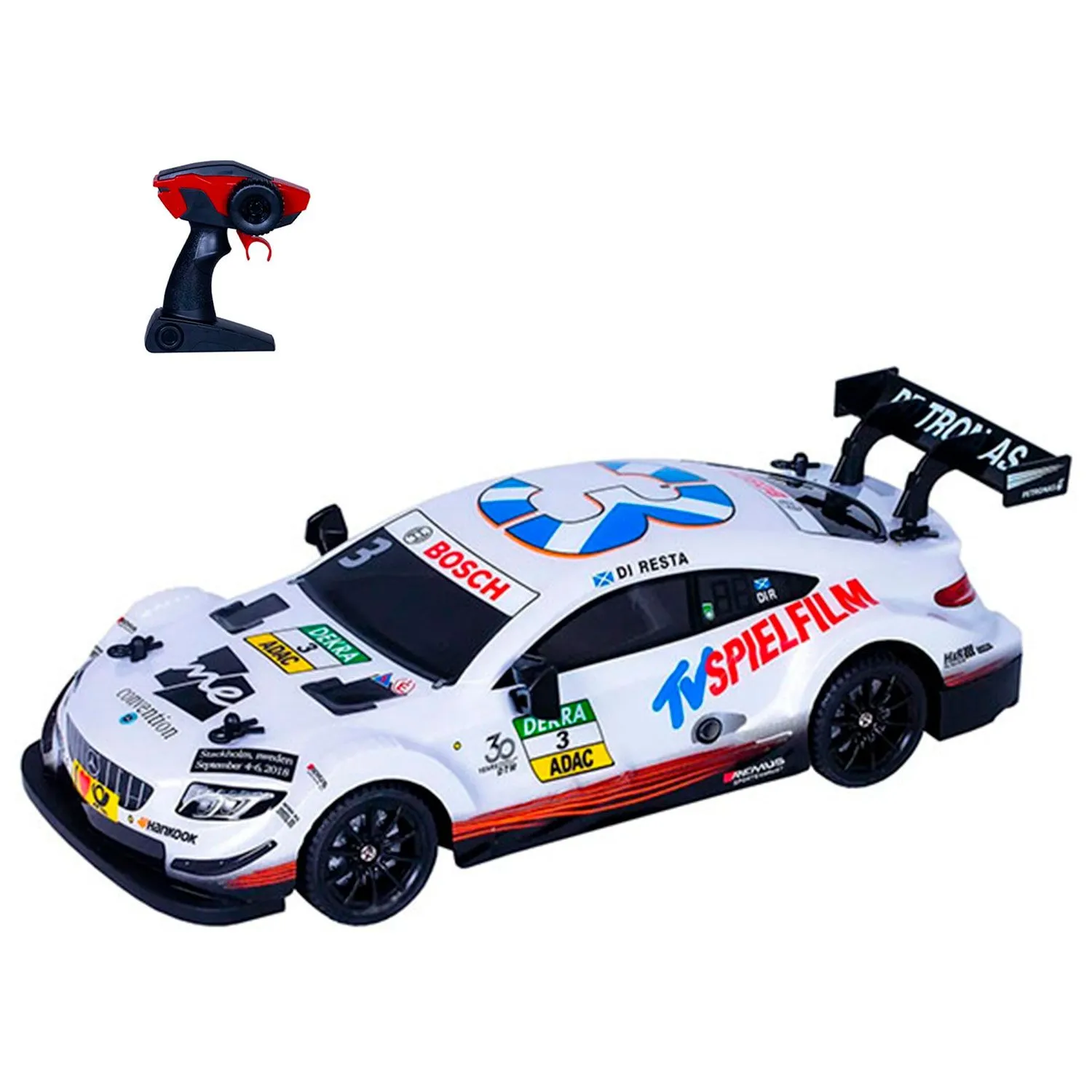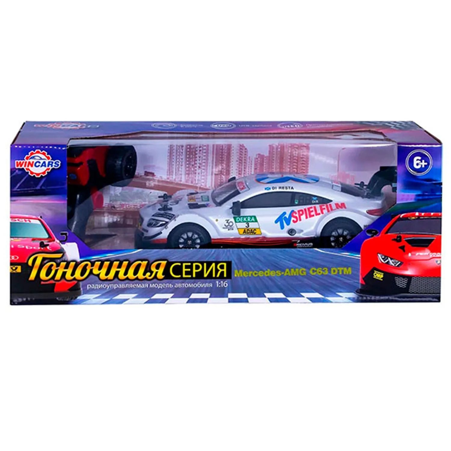 - имеет ударопрочный кузов, спортивный дизайн с логотипами и номерными знаками