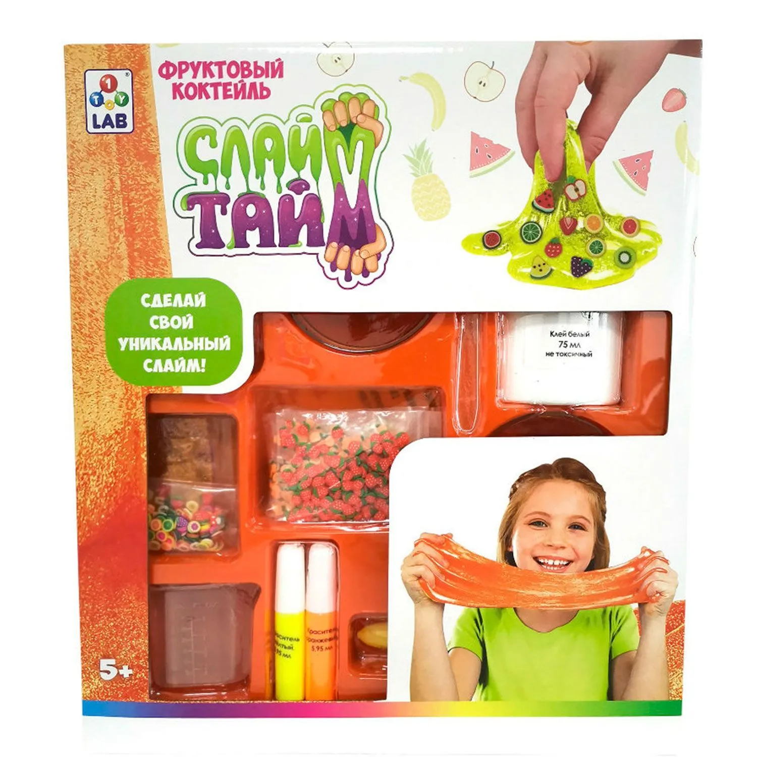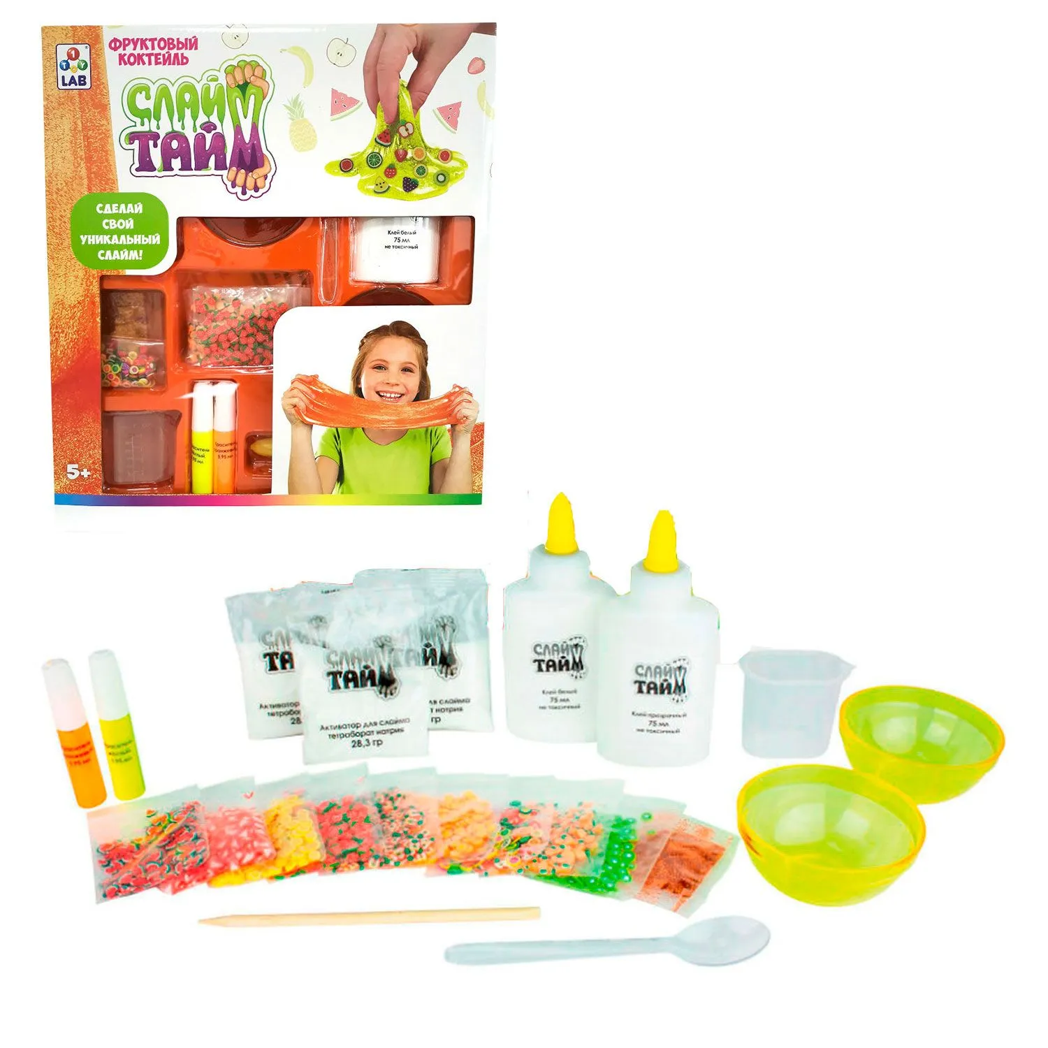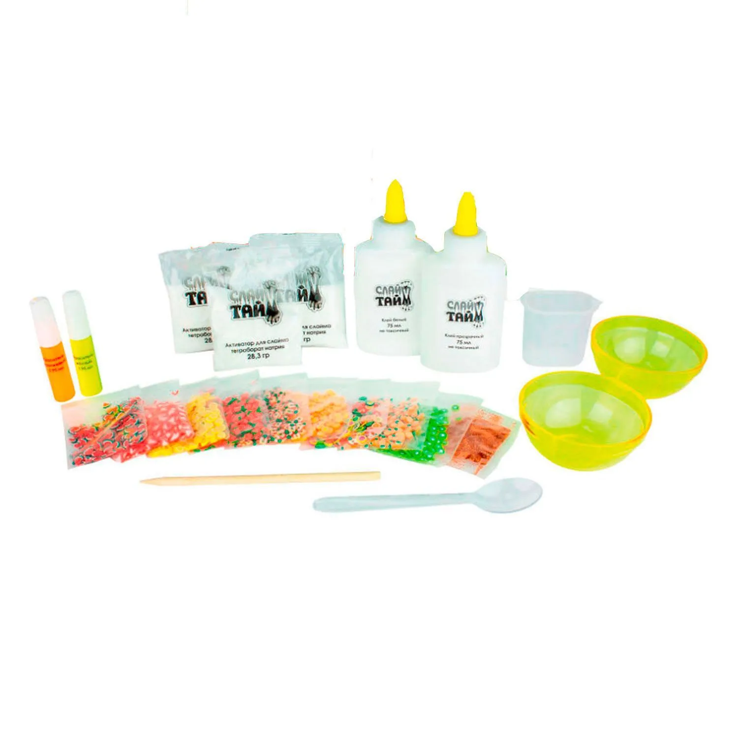 - в комплекте присутствует все необходимое для создания нескольких видов слаймов: прозрачного, цветного и сверкающего