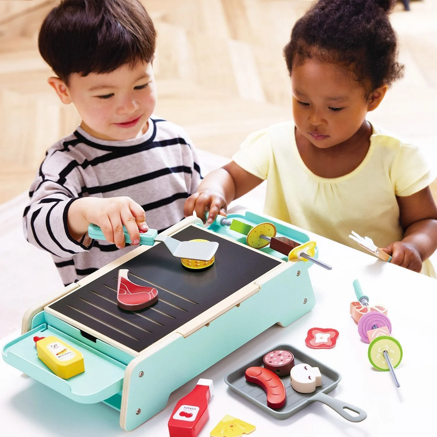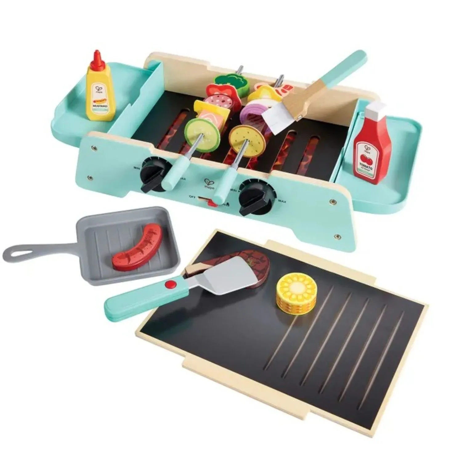 - в наборе 24 предмета: прибор для жарки, два шампура, две лопатки, бутылки соуса и горчицы, пластины в виде продуктов, а также сковорода и панель-плита