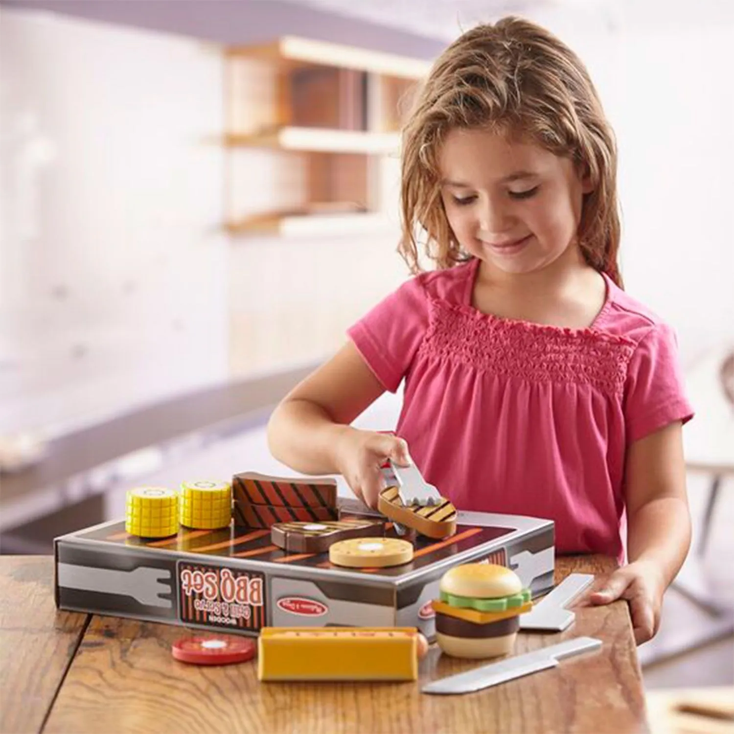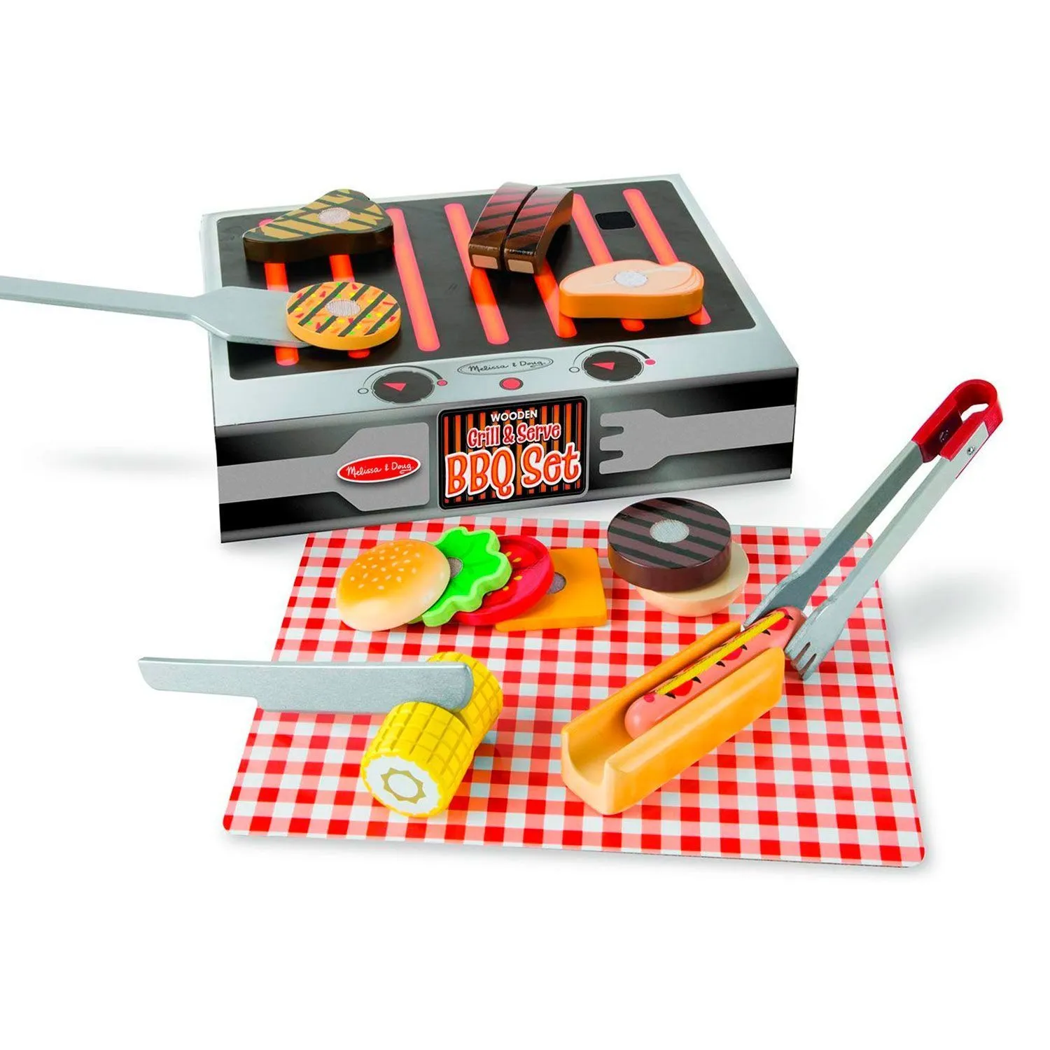 Из набора в 20 деревянных предметов, ребенок сможет приготовить такие знаменитые гриль-фавориты, как хот-дог, гамбургер, стейк, ребрышки, а вдобавок приправит это все знаменитыми соусами.
