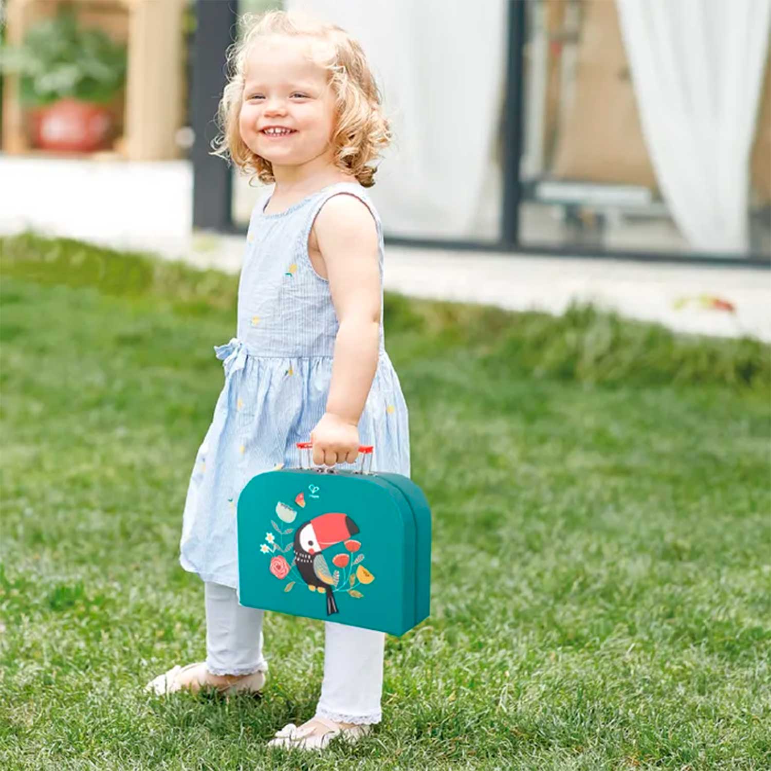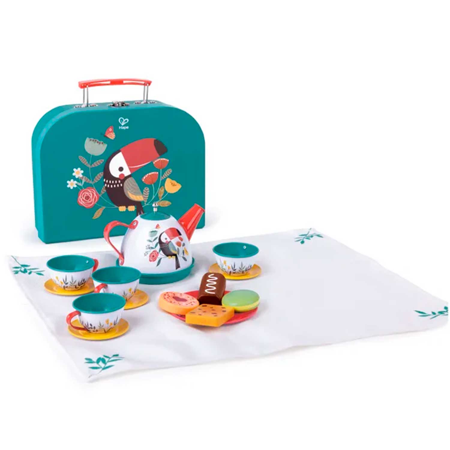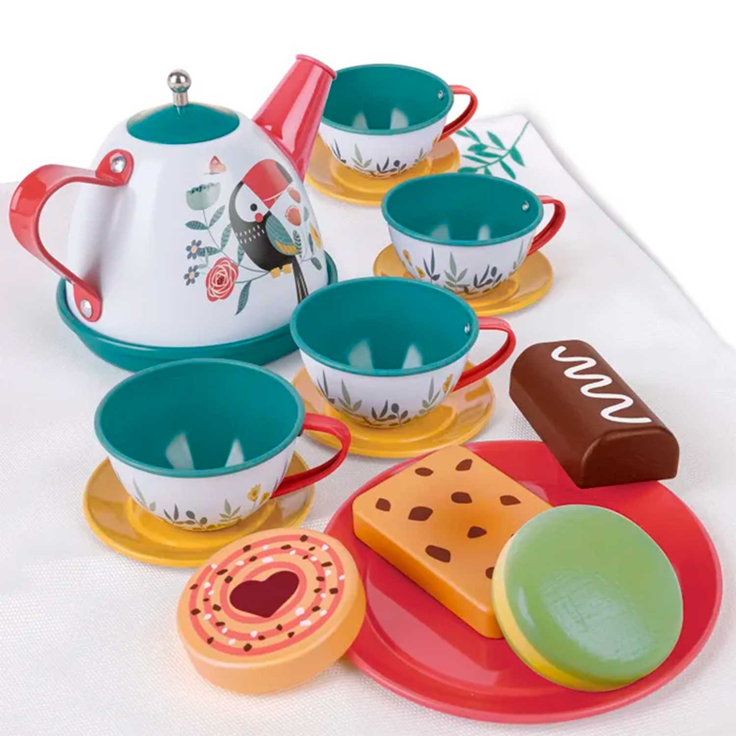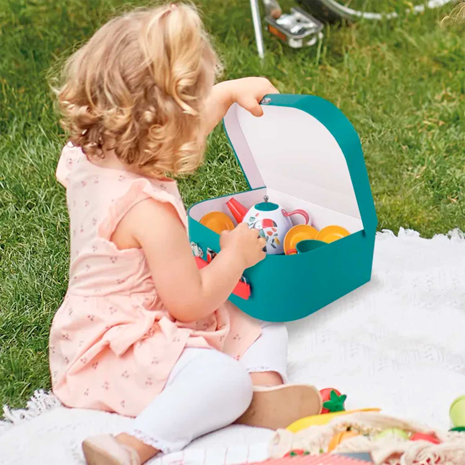 - в стильном чемоданчике собрано 16 предметов, включая чайник, чашки, блюдца и даже игрушечное печенье