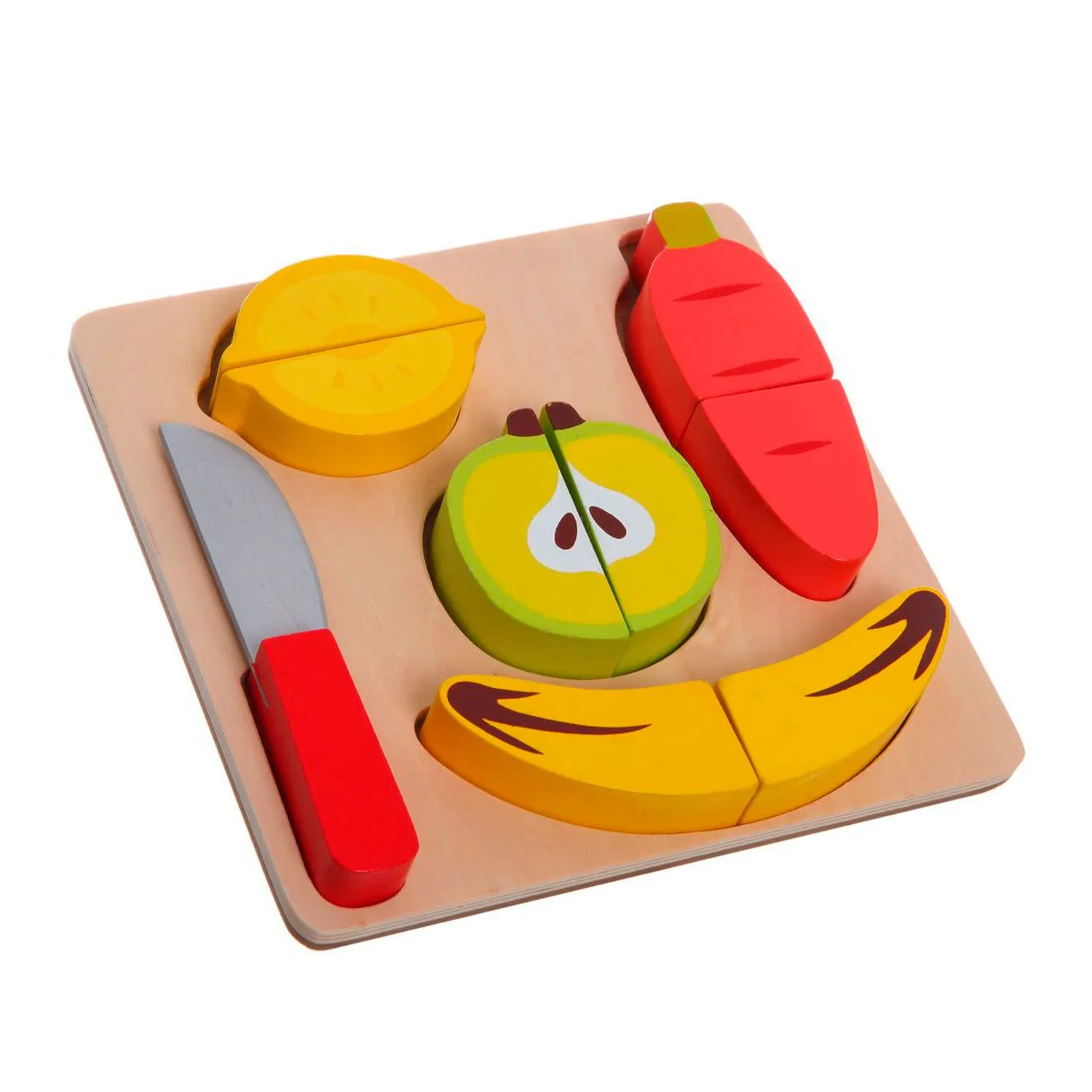 - приятные деревянные детали овощей и фруктов имеют реалистичные формы и скрепляются между собой липучками, которые легко "разрезать" деревянным ножиком
