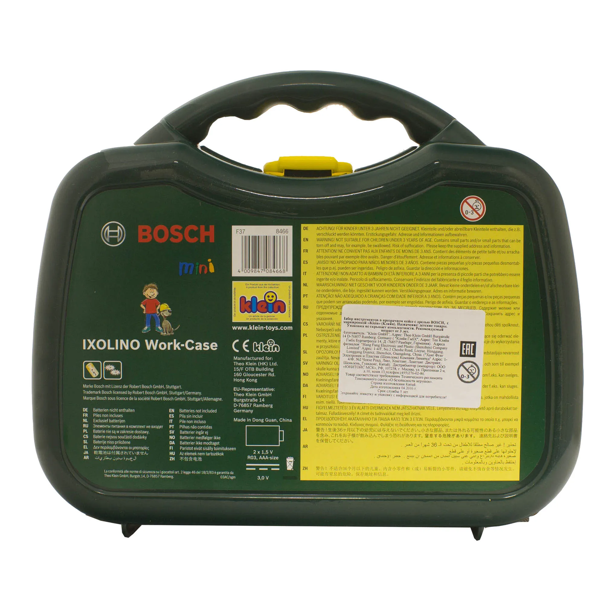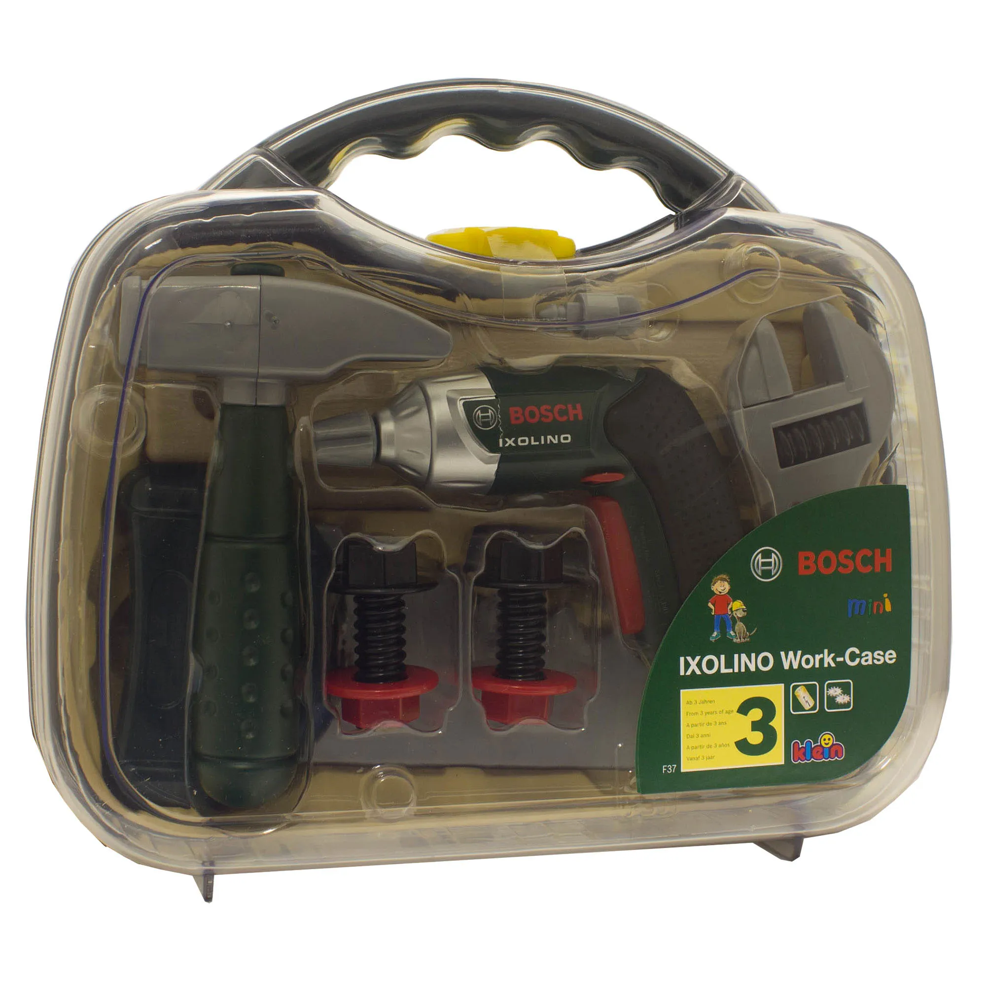 Набор детских инструментов, представленный известным производителем Klein, упакован в прозрачный пластиковый чемоданчик. В комплект набора входят: молоток, пила, разводной ключ, крепежные детали и шуруповерт Bosch. Шуруповерт работает от батареек. С его помощью можно закручивать и раскручивать крепежные детали. Во время работы шуруповерт издает характерные звуки. Все предметы из набора очень похожи на настоящие столярные или плотницкие инструменты. Ролевые игры с имитацией строительных или ремонтных работ учат основам ручного труда.