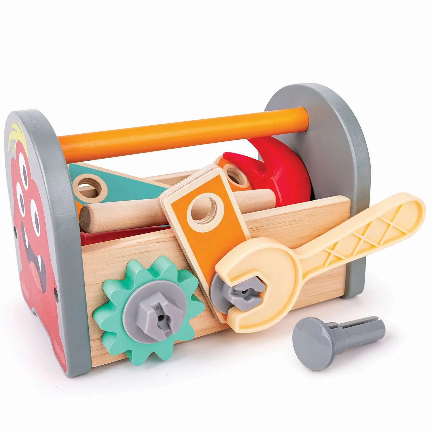 - набор включает ящик для инструментов с милым дизайном , три гайки с болтами, две шестерёнки, один гаечный ключ, одну отвертку, один молоток и другие необходимые строительные инструменты, которые помогут малышу строить и ремонтировать