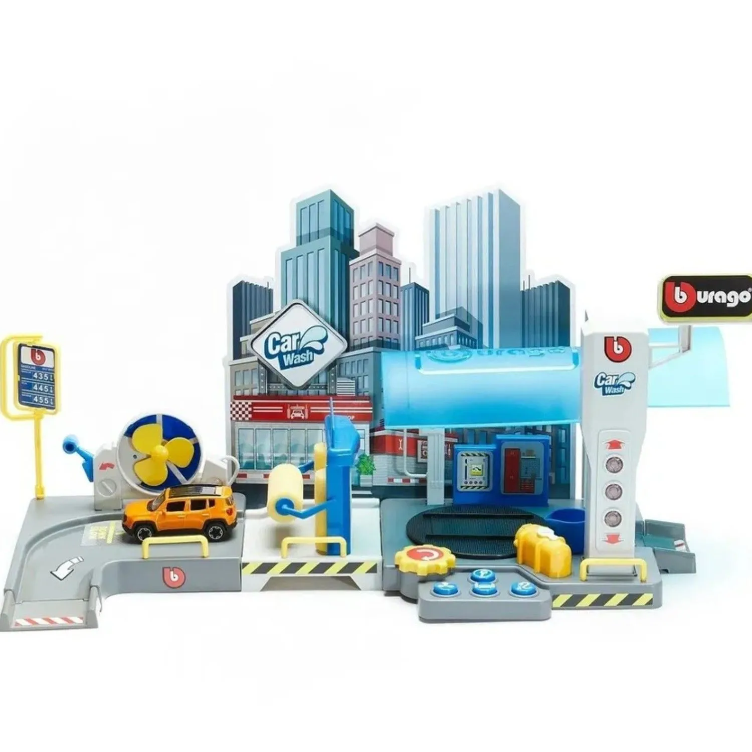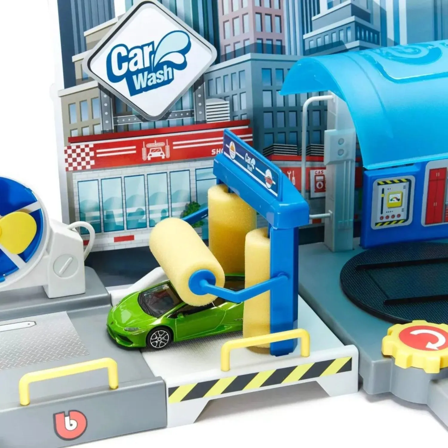 Интерактивный игровой набор Автомойка с машинкой от бренда Bburago (18-30406) - это отличный подарок для ребенка от 3-х лет для сюжетно-ролевой игры на тематику услуги автомойки и оснащена различными реалистичными спецэффектами.