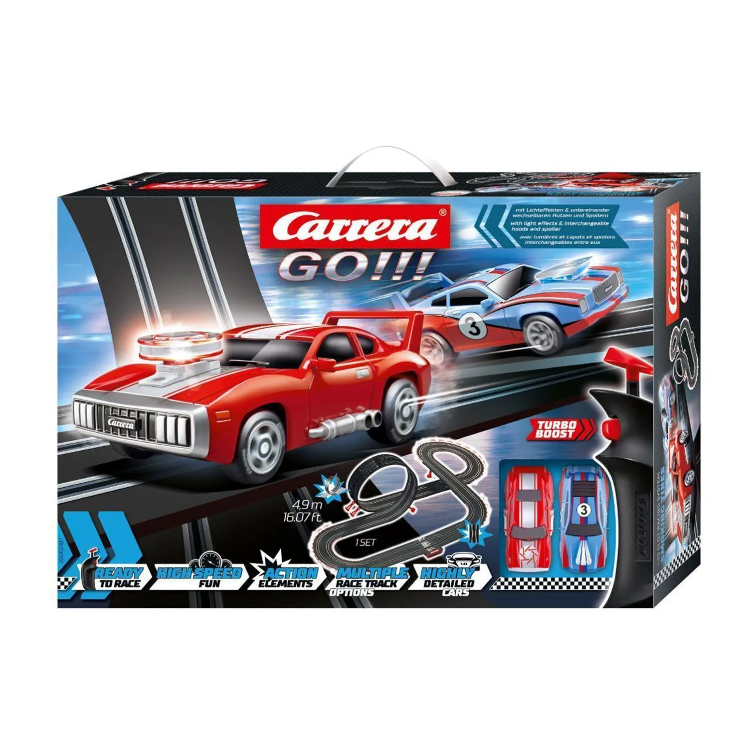 В новом наборе Carrera GO!!! Smoking Tires на гоночной трассе для дуэли встретятся два американских монстра-гонщика. Эти удивительные чудовища отличаются невероятной мощью, сумасшедшими яркими полосами на корпусе, крутыми капотами и огромными спойлерами.