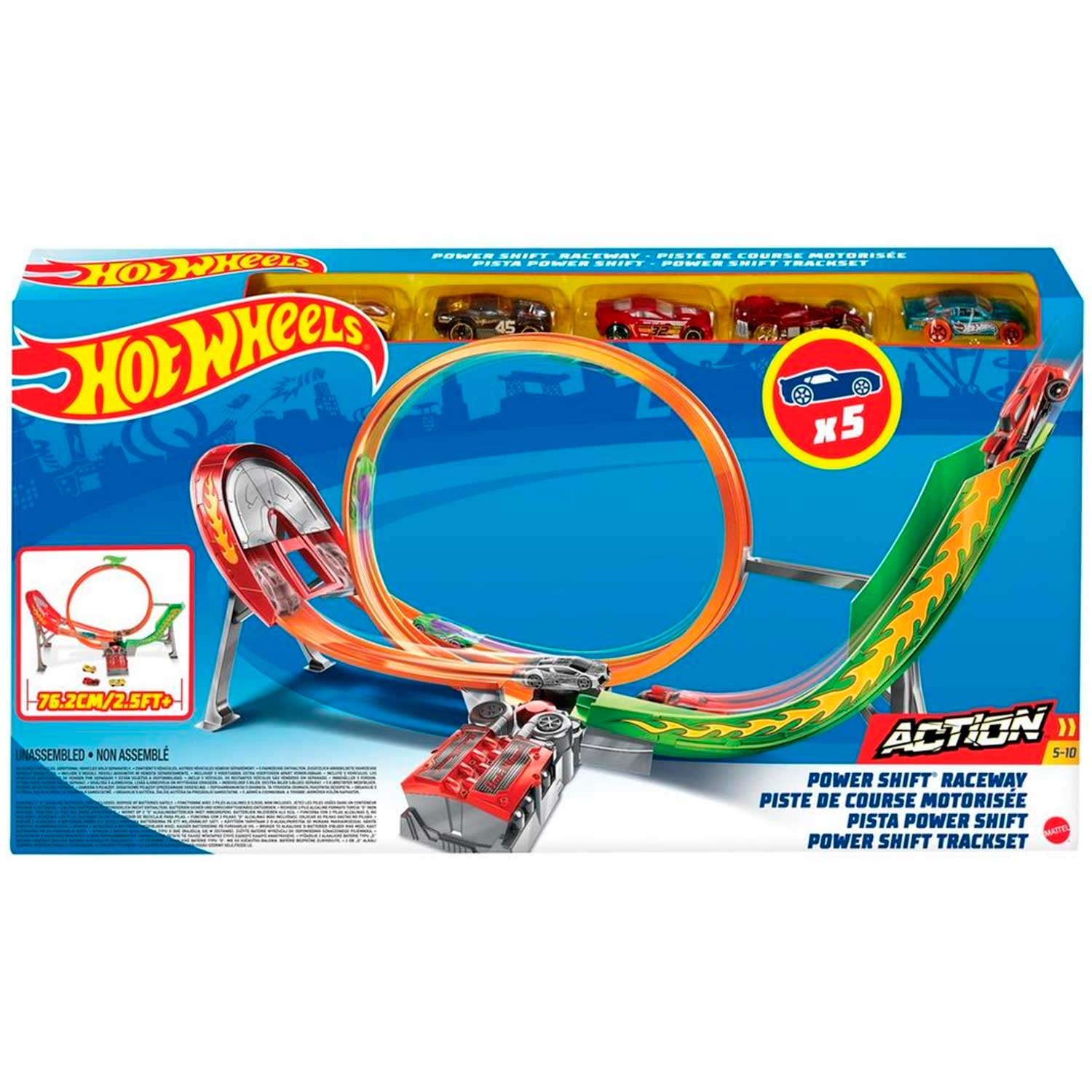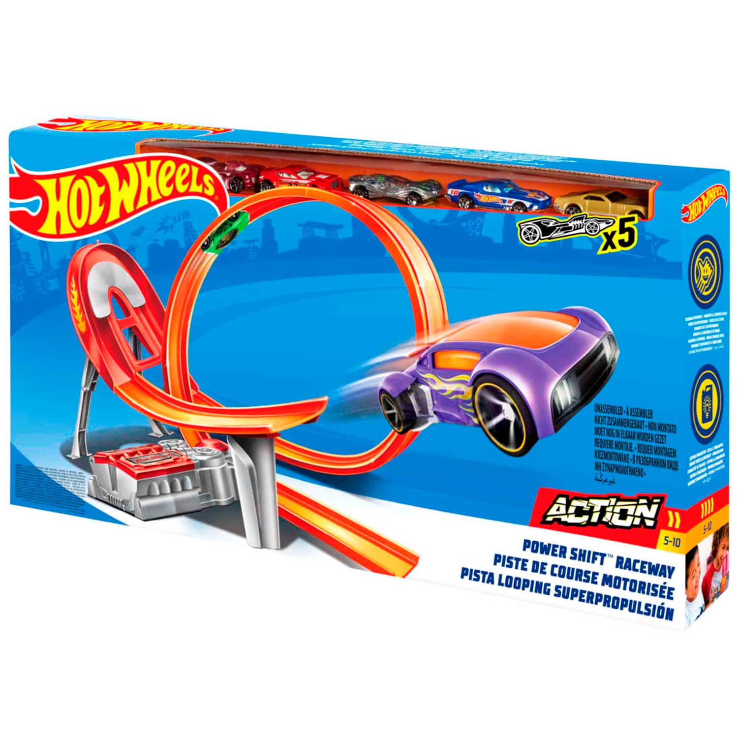 - 5 оригинальных машинок Hot Wheels в комплекте — можно устраивать соревнования сразу с несколькими участниками