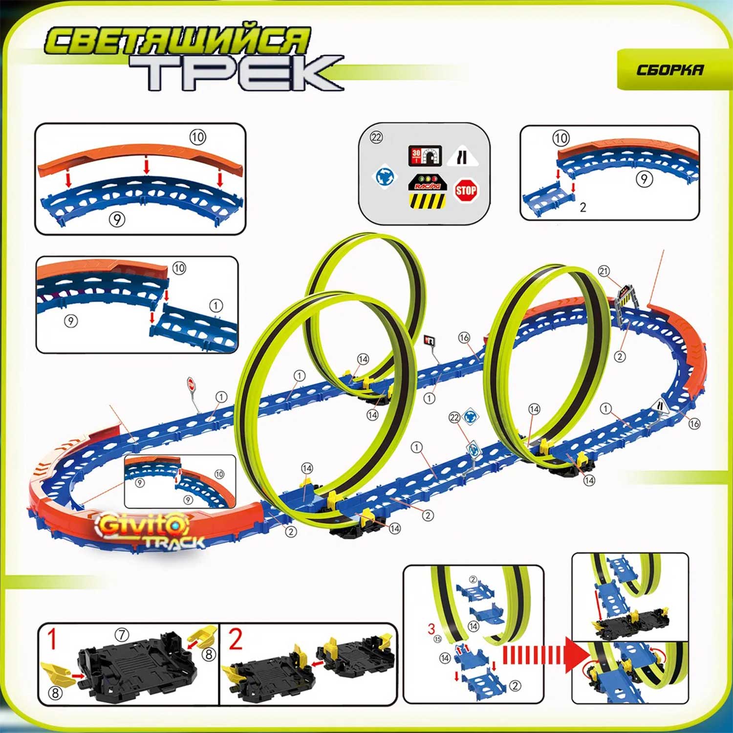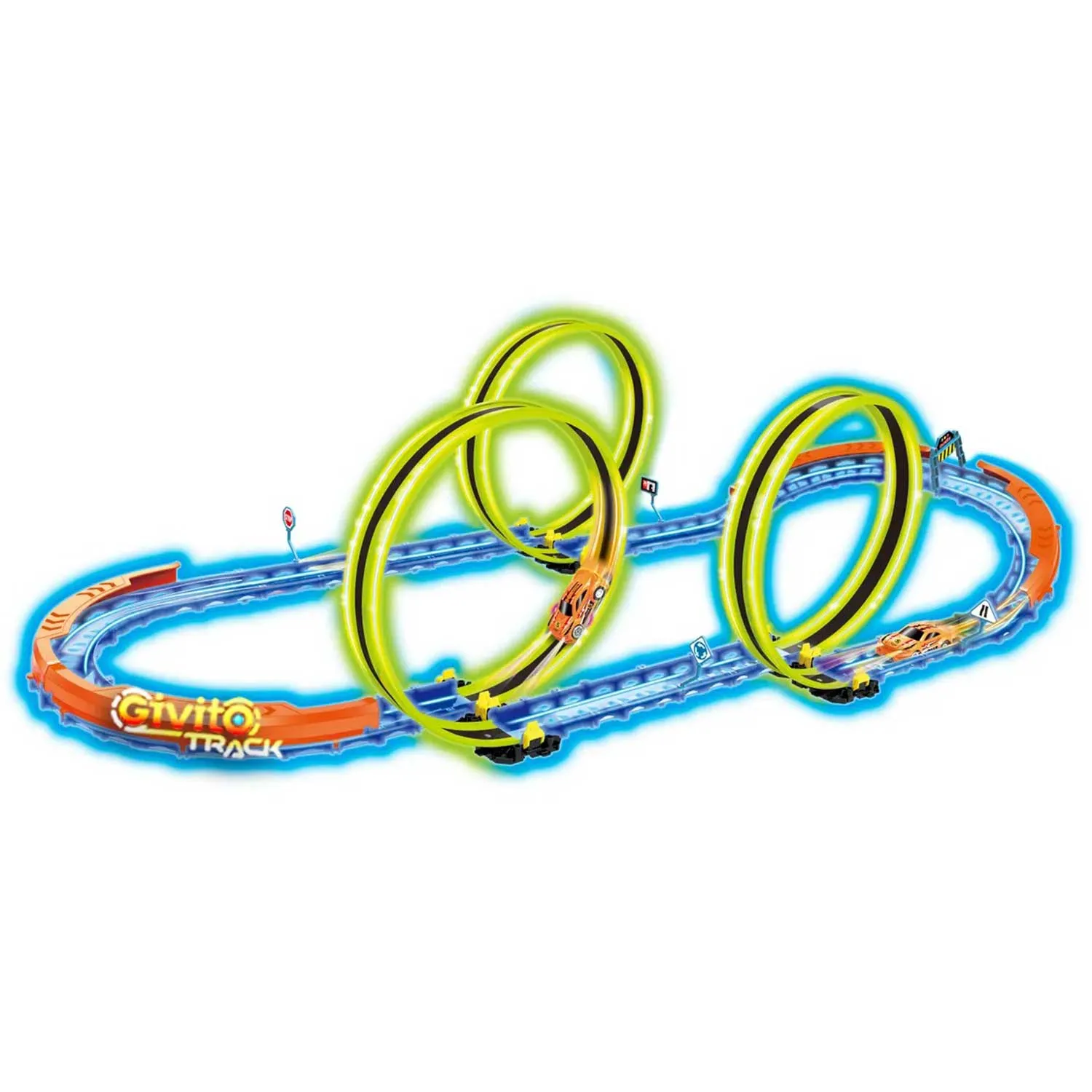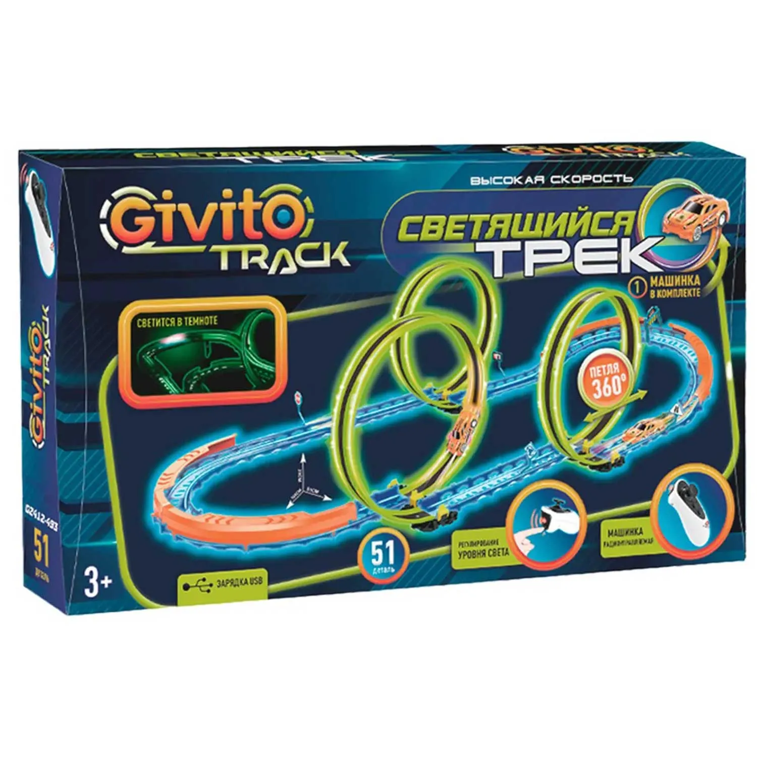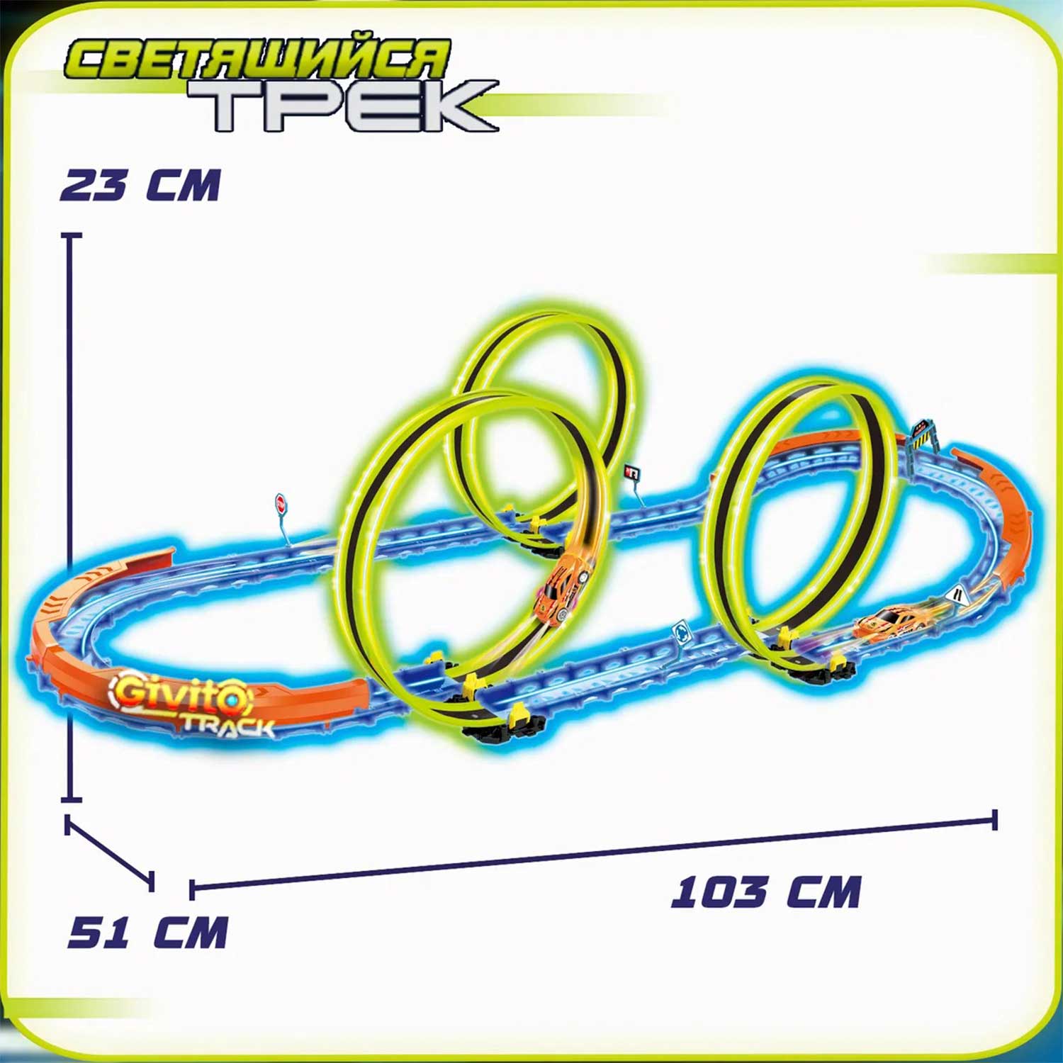 Светящийся автотрек Givito — это динамичная гоночная трасса с тремя неоновыми петлями 360°, которая превращает игру в яркое шоу.
