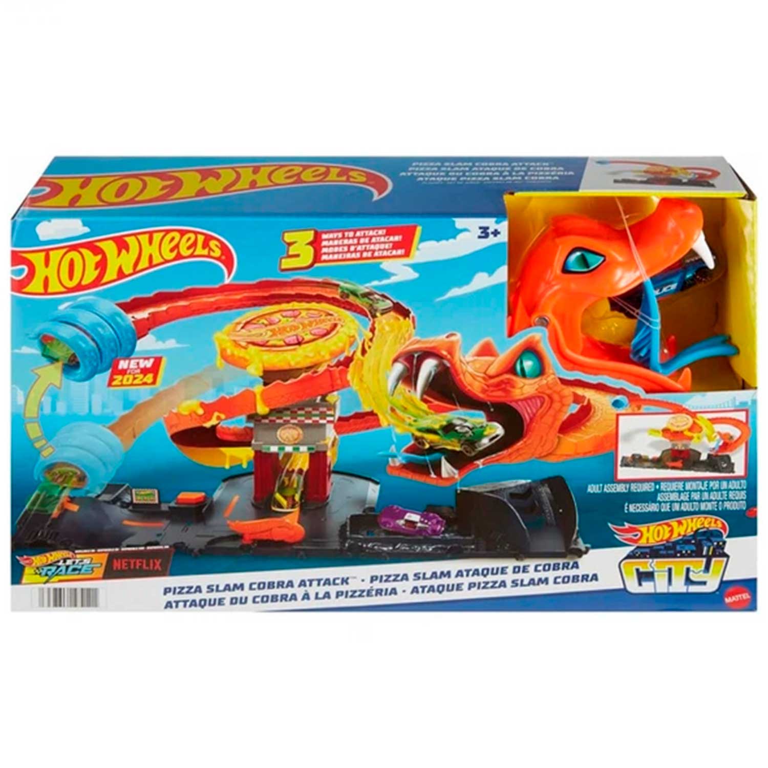 Игровой набор Hot Wheels HTN81 «Атака кобры» — это не просто трек, а целая история, где ребёнок участвует в спасении города Hot Wheels.