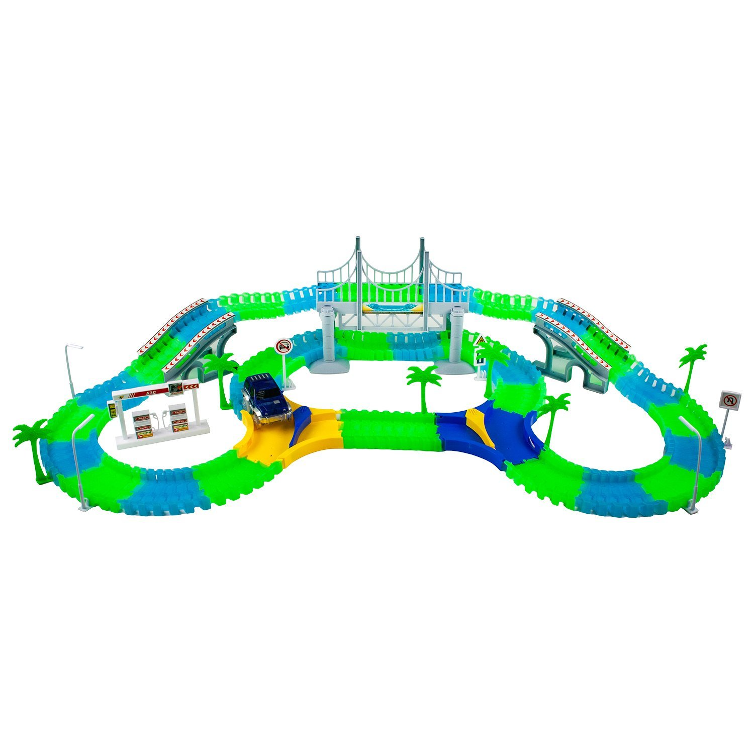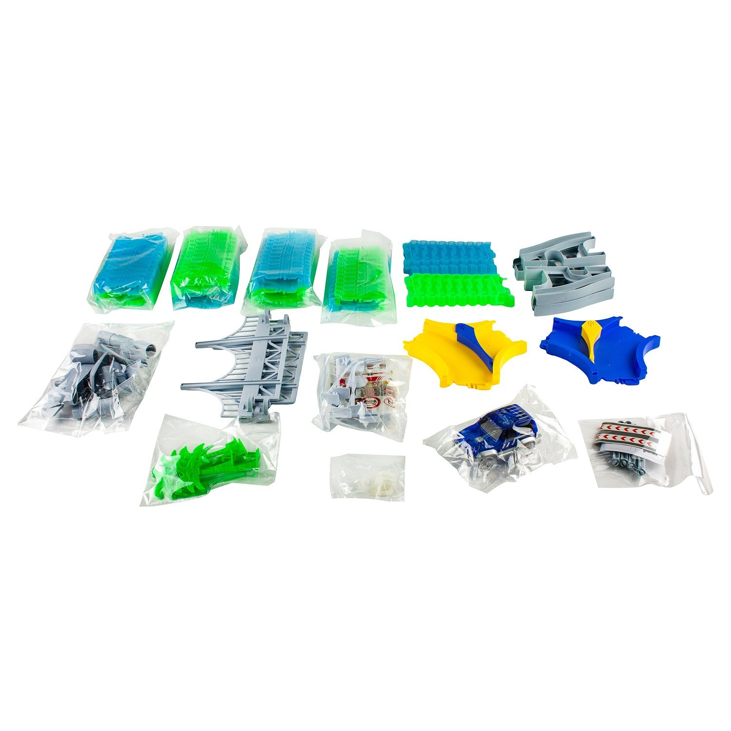 - набор включает в себя 216 деталей, включающих элементы трассы, мосты, арки, автомобиль