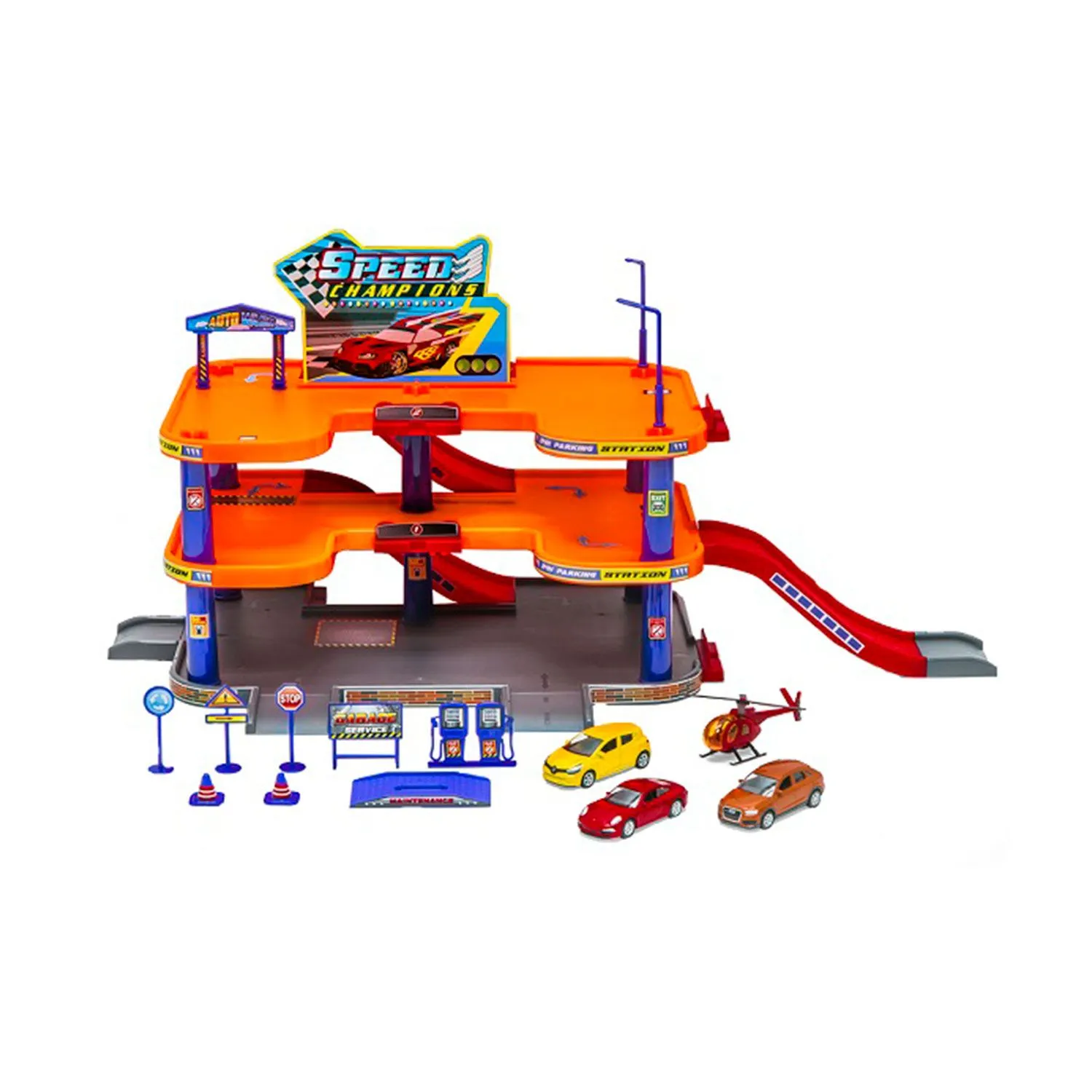 - поставляемые в комплекте автомобили выполнены в виде двух внедорожников и одной легковой машины, в наборе имеется вертолет
