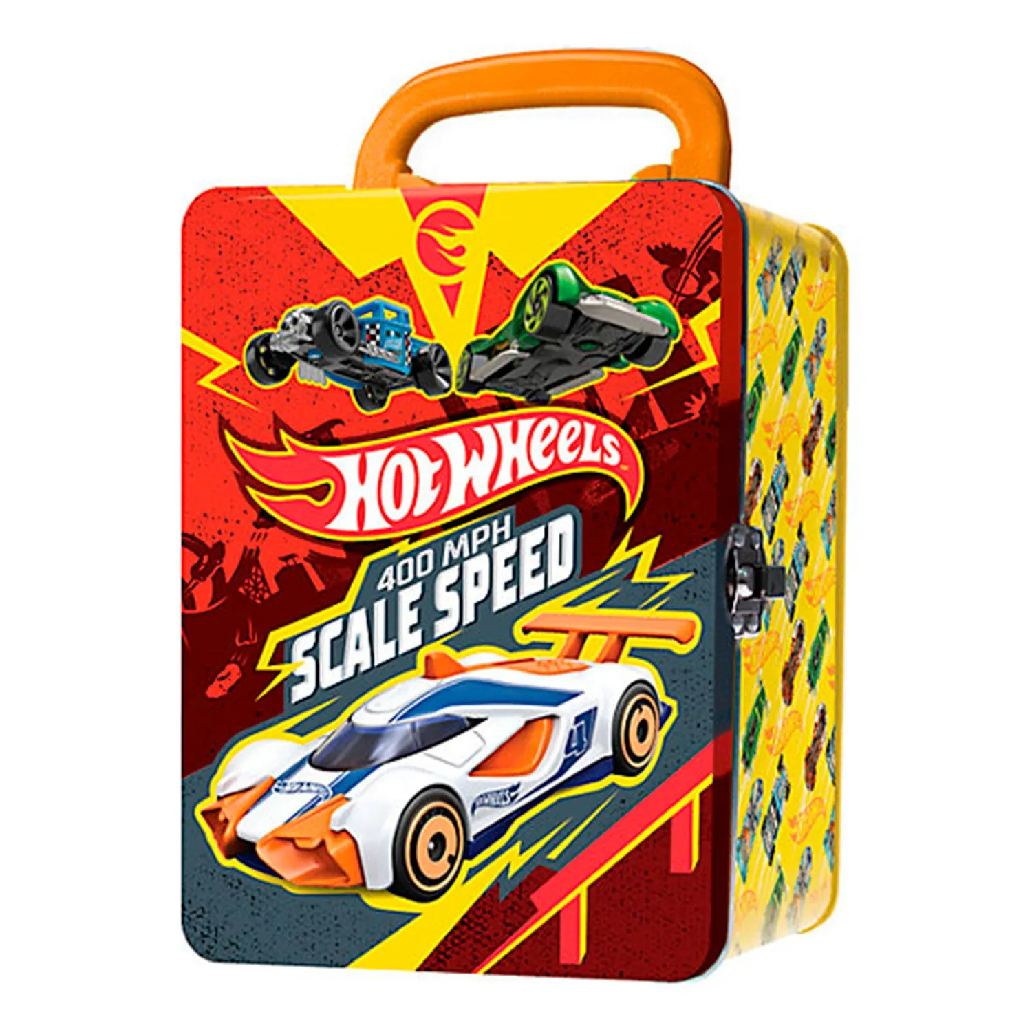 • прочная, яркая металлическая коробка с рельефным изображением машинок Hot Wheels на лицевой части